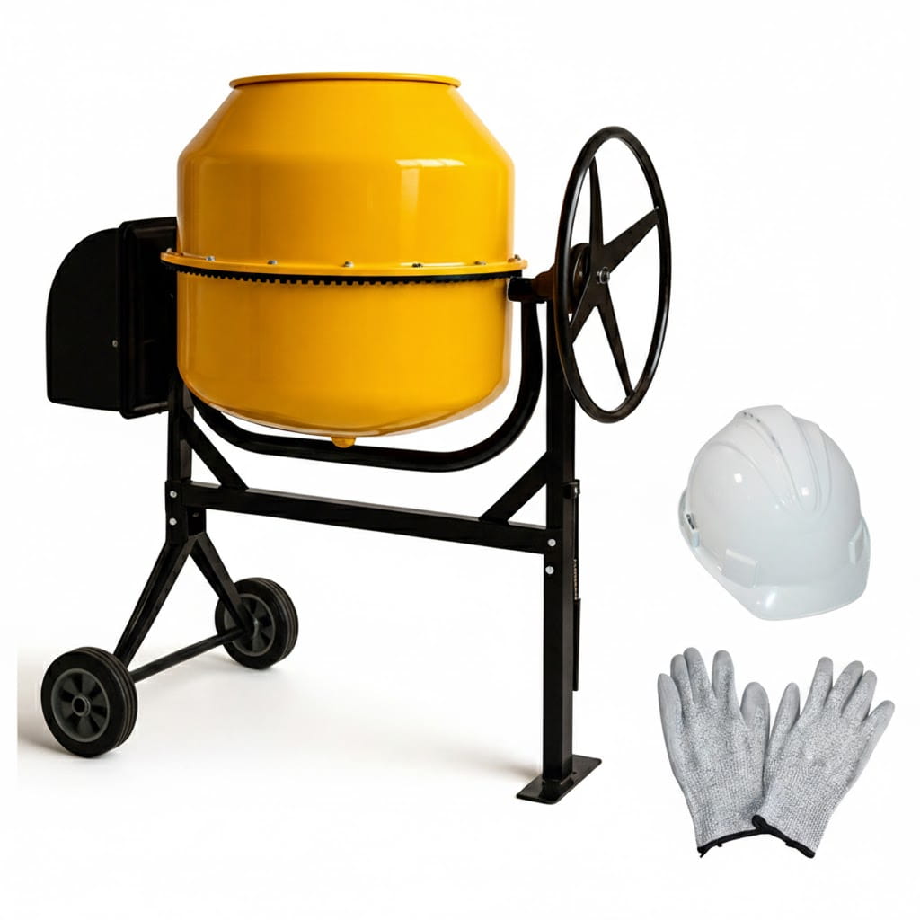 - Bezpieczeństwo przede wszystkim: Betoniarka posiada klasę ochrony IP44. Dodatkowo w zestawie otrzymujesz profesjonalny kask budowlany i rękawice.