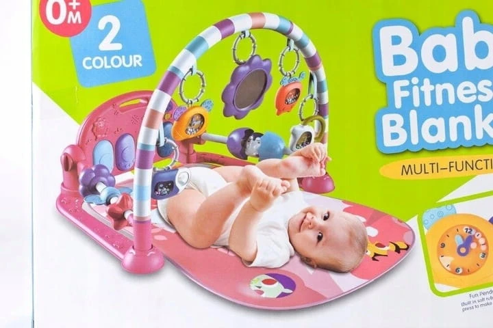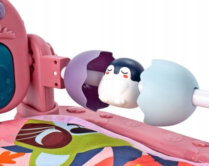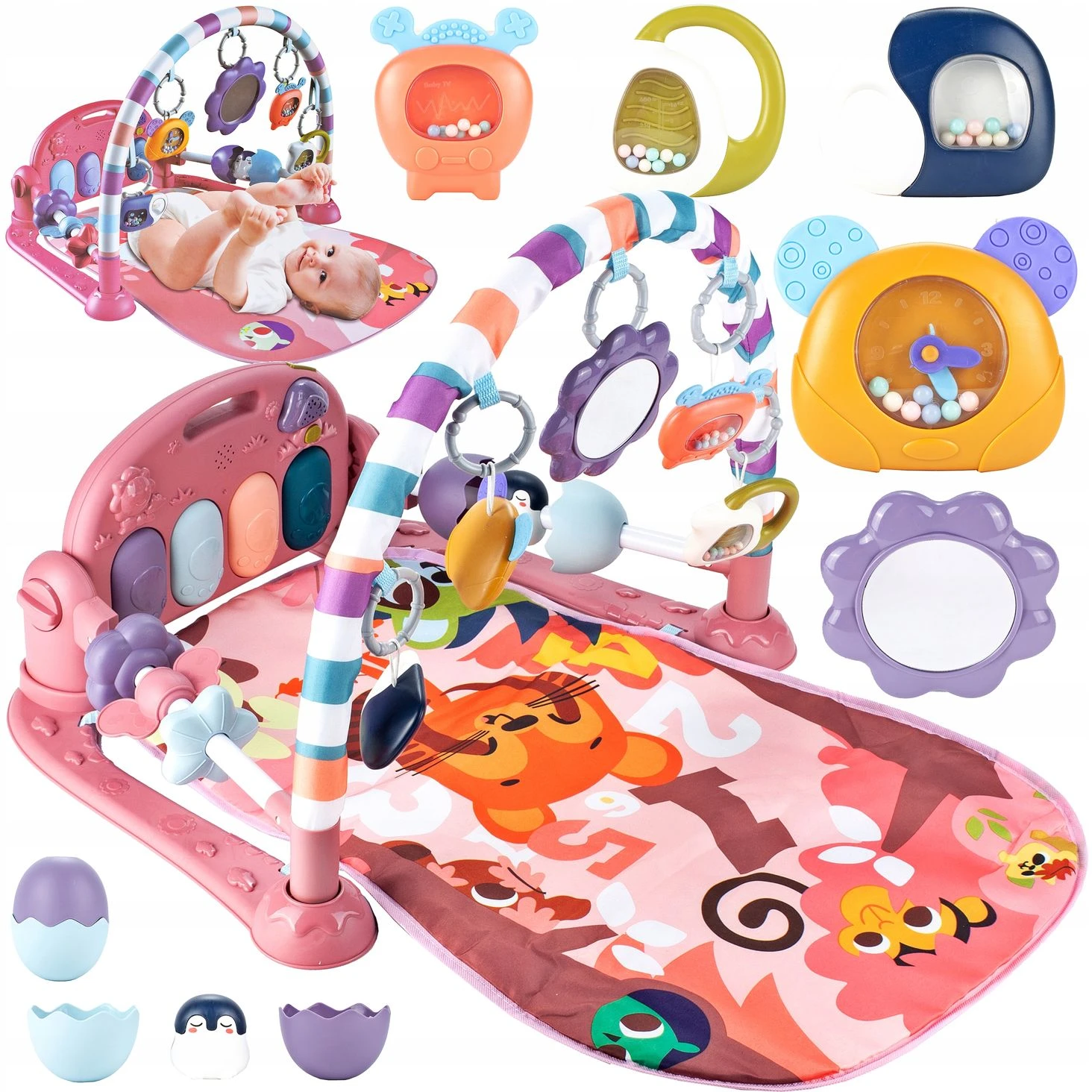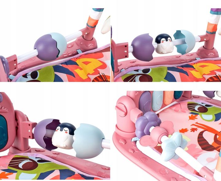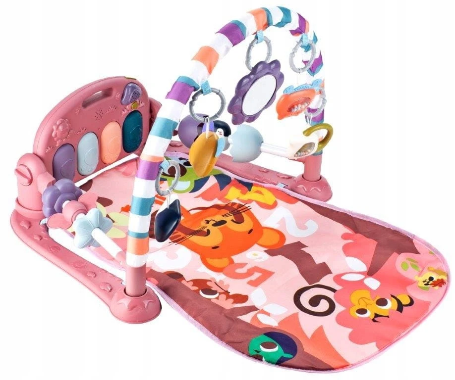 Mata do zabawy dla dzieci zawiera pięć uroczych odczepianych wiszących zabawek oraz pianino z czterema klawiszami i efektami świetlnymi.