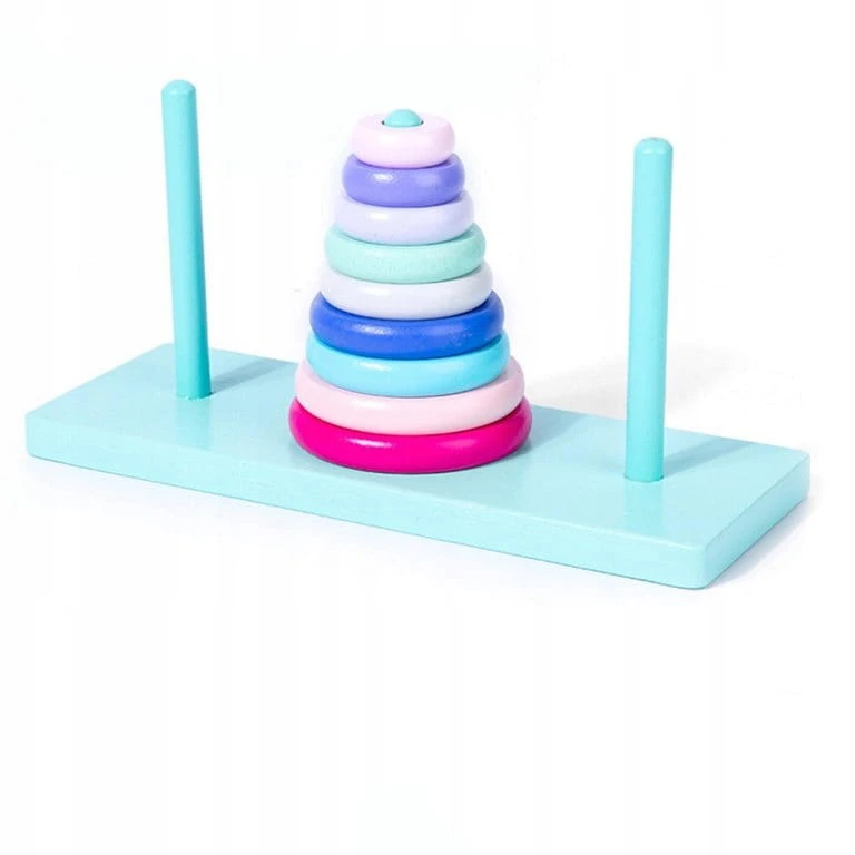 Kolorowa, drewniana piramida z krążkami to klasyczna zabawka edukacyjna, która wspiera rozwój dziecka już od najmłodszych lat. Zabawka składa się z solidnej podstawy oraz trzech pionowych kołków, na które dziecko nakłada różnokolorowe, gładkie krążki o różnych rozmiarach.