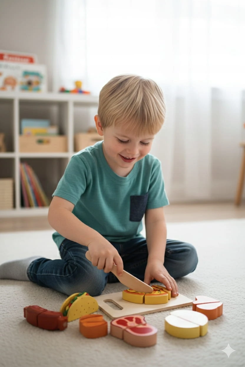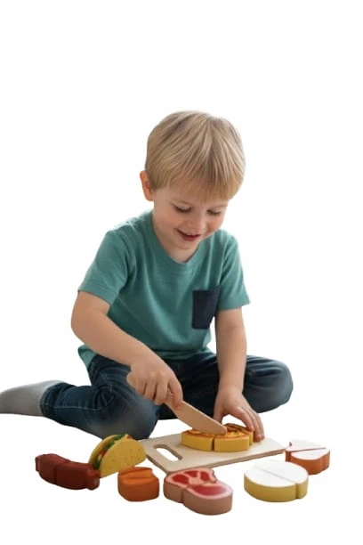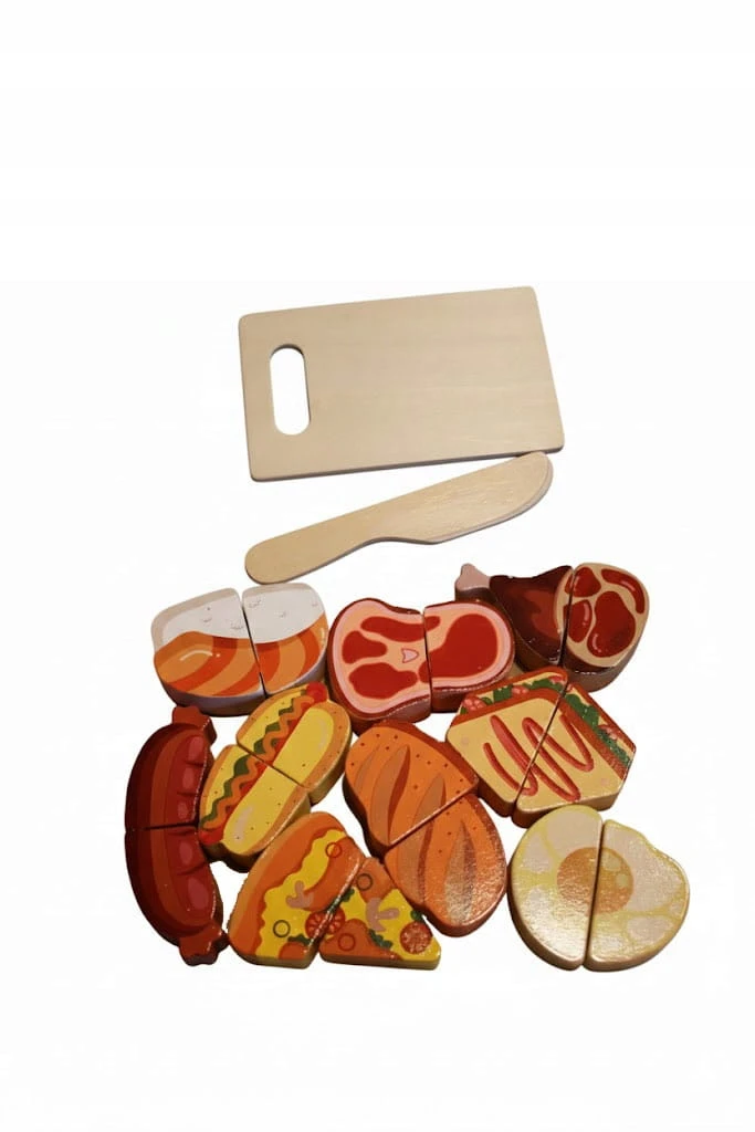 - Realistyczna Zabawa w Krojenie: Elementy (np. jajko, pieczywo, warzywa) są połączone rzepem. Przecinanie ich za pomocą bezpiecznego, drewnianego nożyka imituje prawdziwe krojenie, ucząc precyzji.