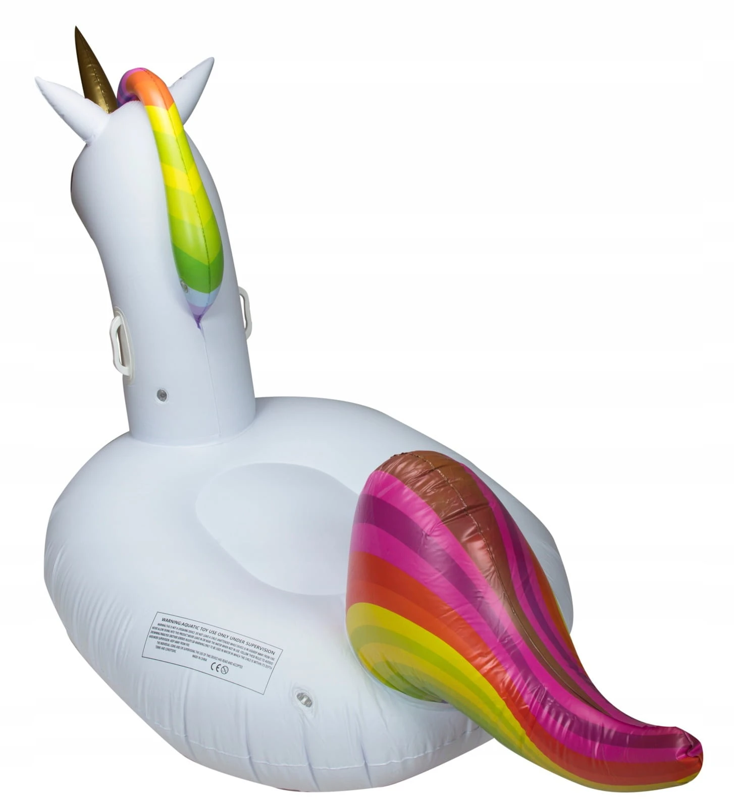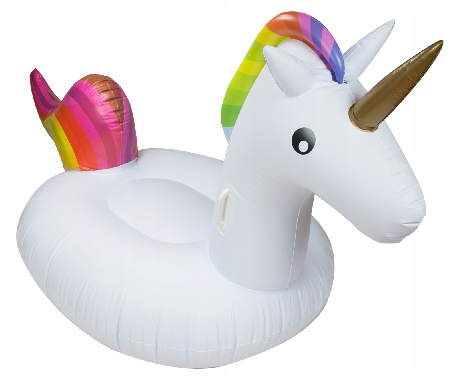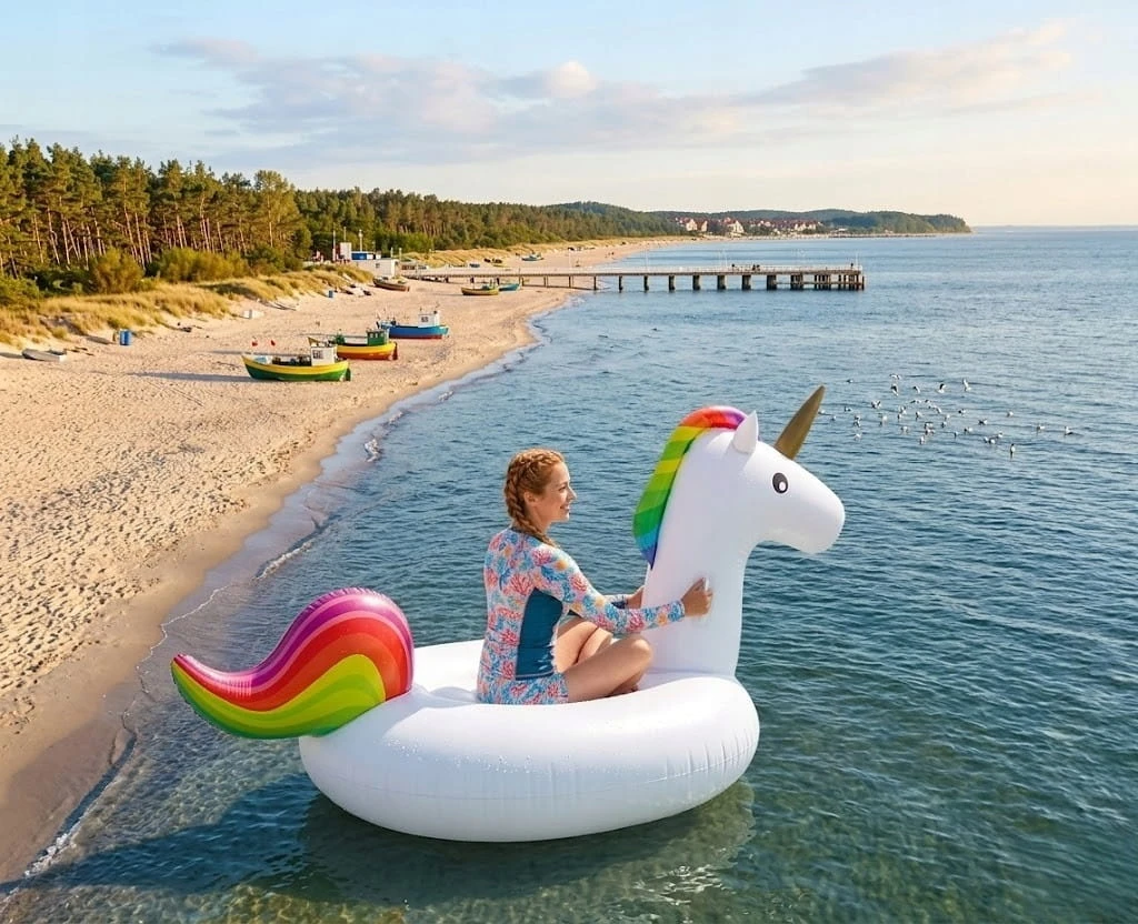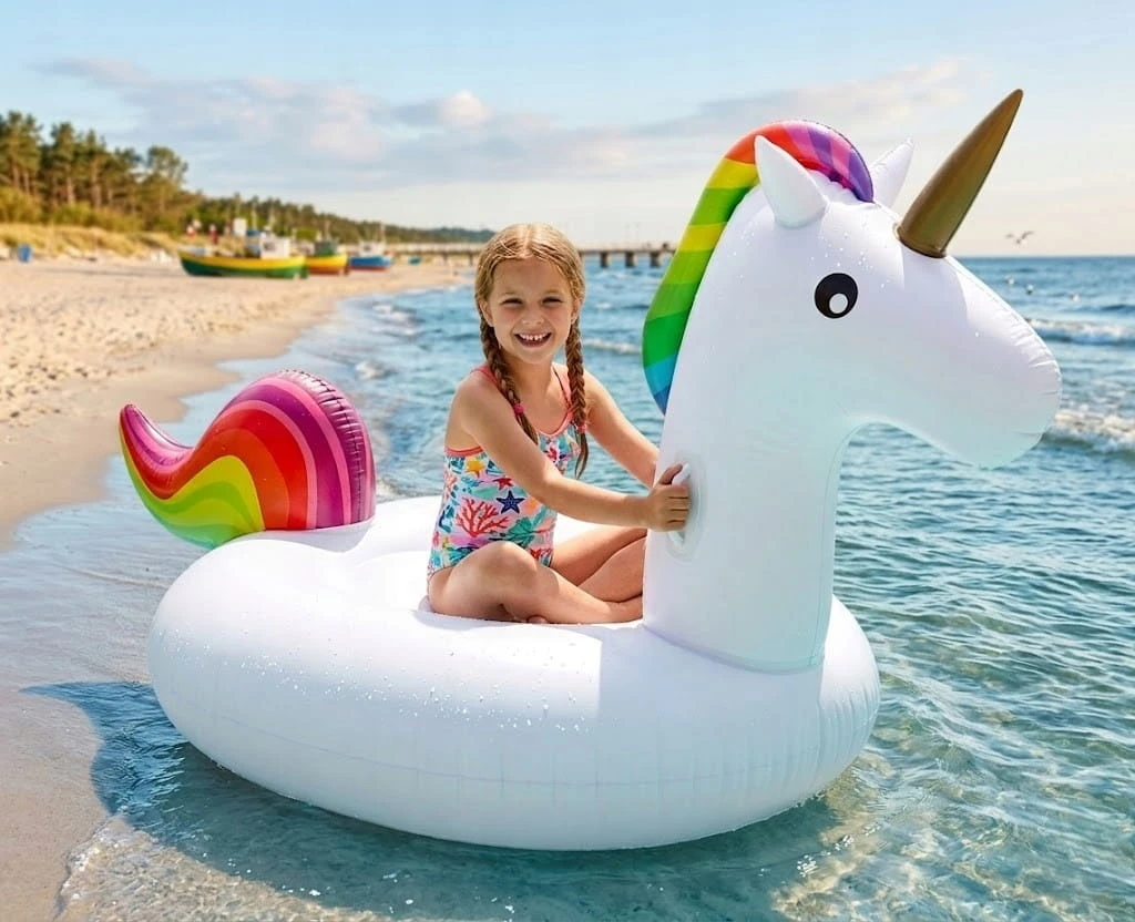 - Magiczny Design: Śnieżnobiały korpus z tęczową grzywą i złotym rogiem – gwarantuje, że będziesz wyróżniać się na każdej plaży.