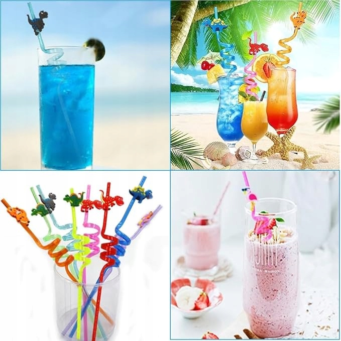 Opakowanie zawiera 16 plastikowych słomek (kolor: jak na zdjęciu) o średnicy 5 mm i długości 26 cm. Różne kolory i wzory pozwalają na rozróżnienie używanych słomek.