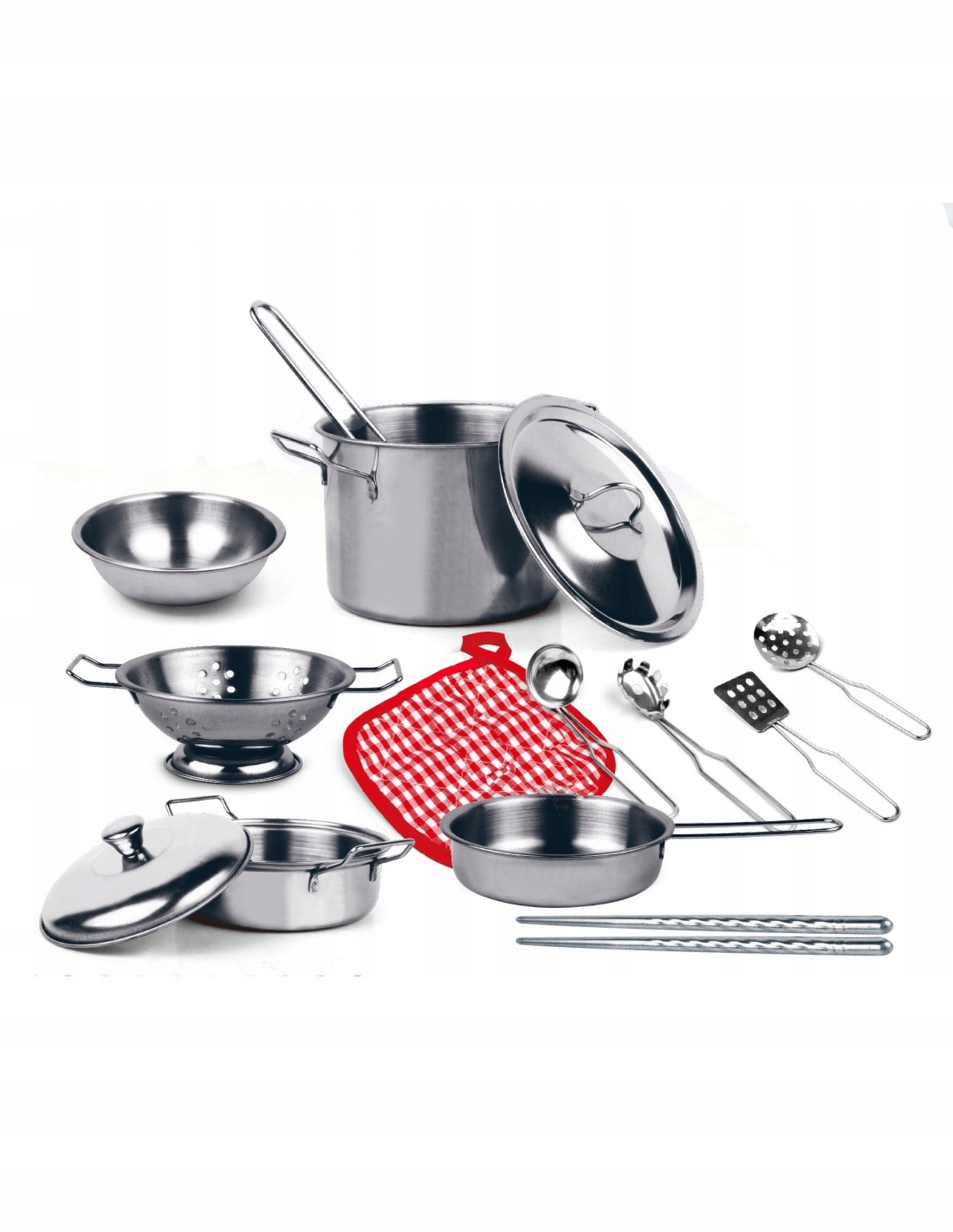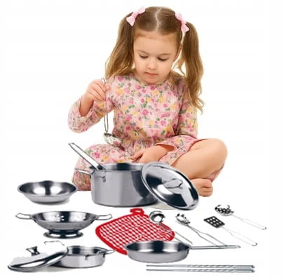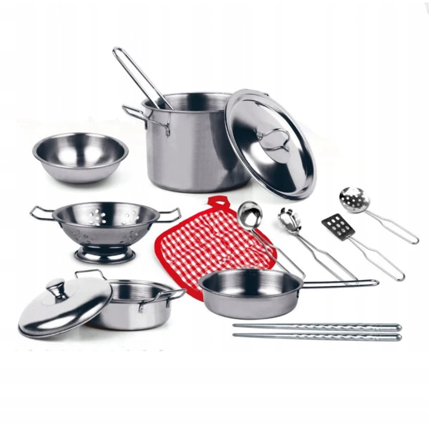 Metalowy zestaw kuchenny dla dzieci - akcesoria kuchenne dla dzieci oraz metalowe garnki o różnej wielkości. Doskonale sprawdzi się podczas zabawy w domu, w gotowanie. Kuchnie dla dzieci z takim wyposażeniem mogą sprawić, że zabawa w gotowanie może stać się pasją dziecka.