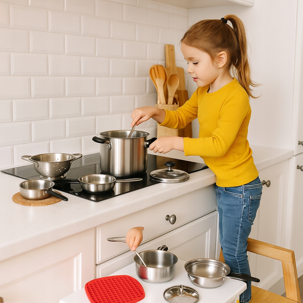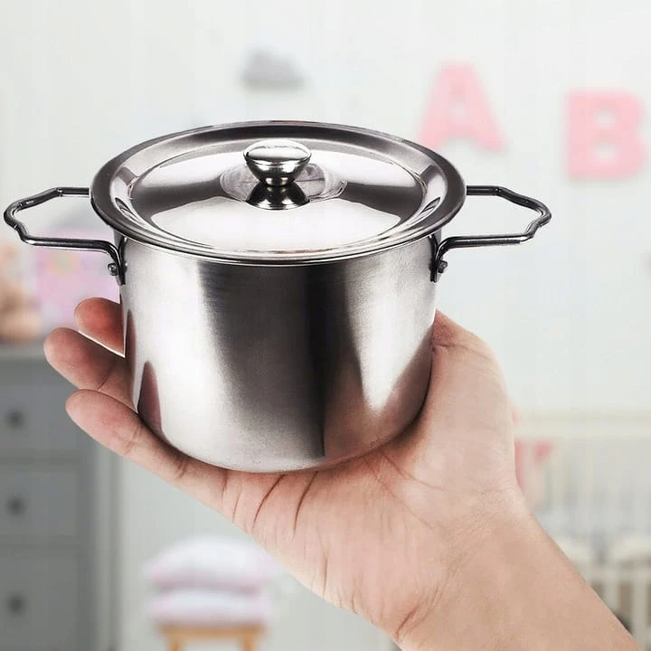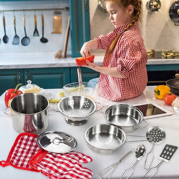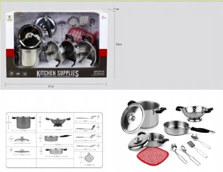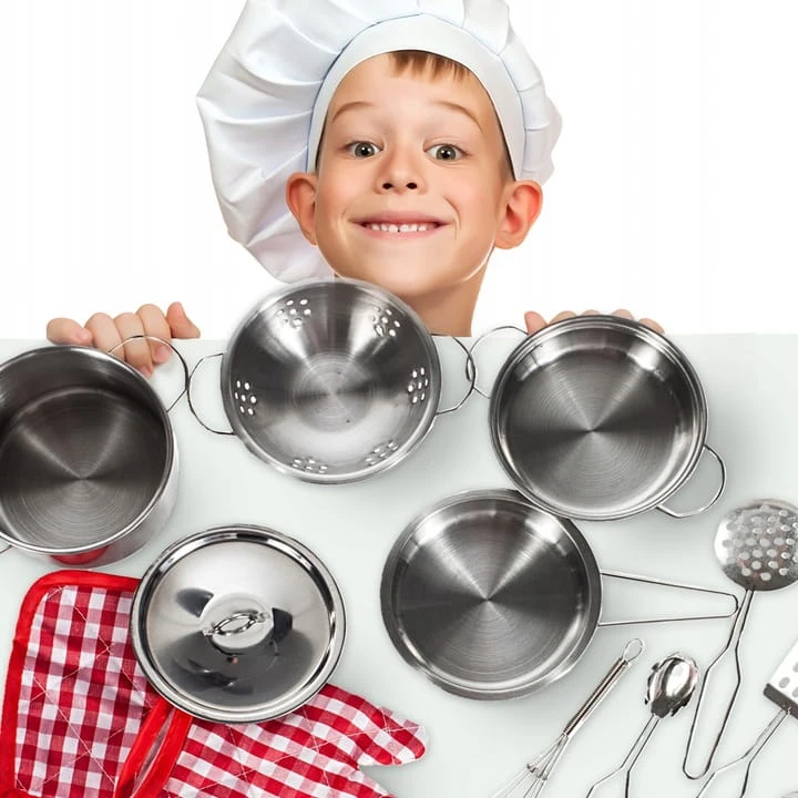 Cały zestaw wykonany jest ze stali nierdzewnej i genialnie imituje prawdziwe garnki kuchenne. Doskonała i długa rozrywka, która łączy zabawę z nauką. Dokładne repliki codziennych przyborów kuchennych, ale w mniejszym rozmiarze z myślą o dzieciach.