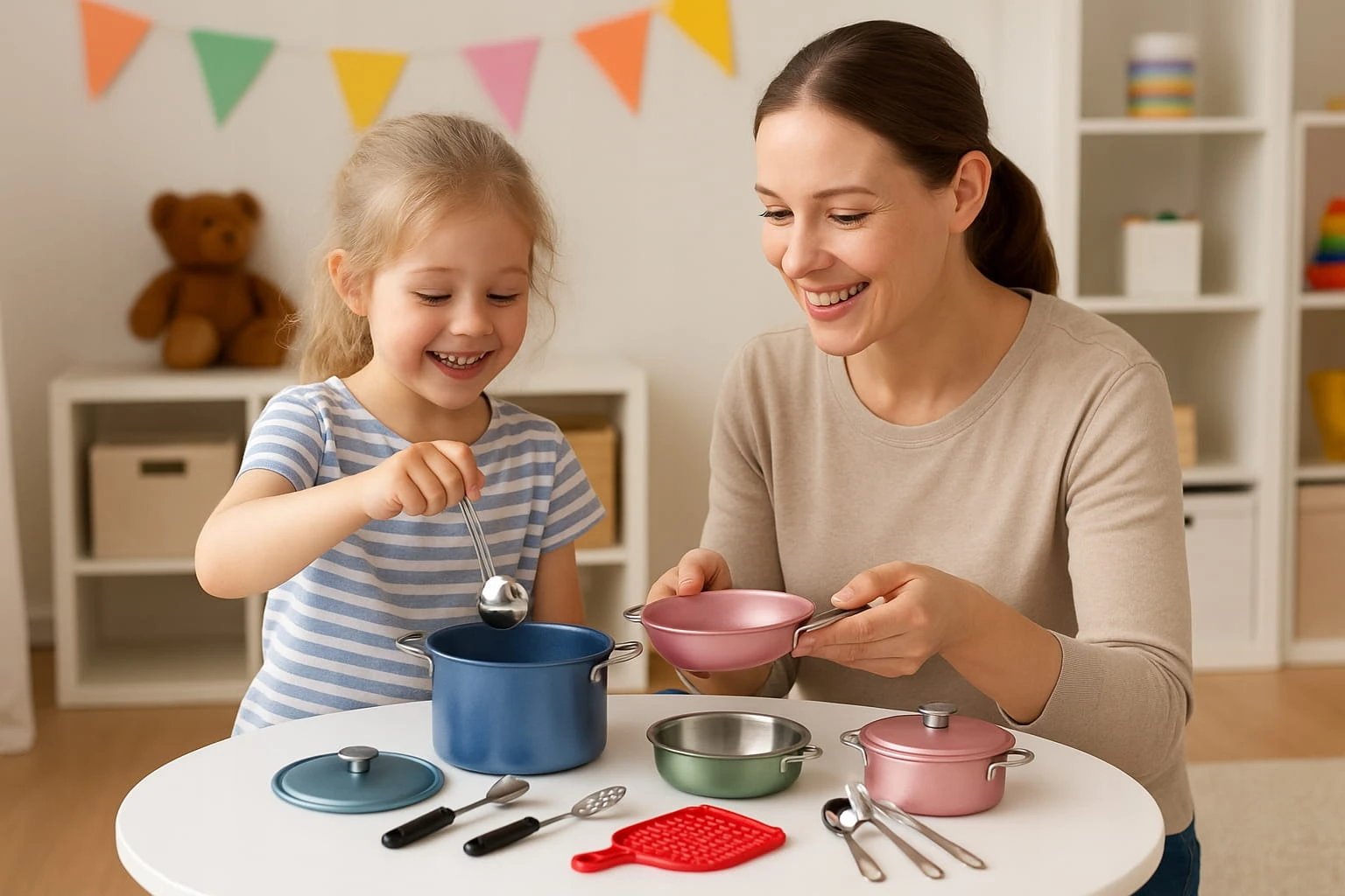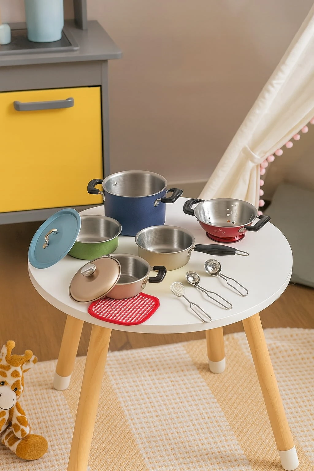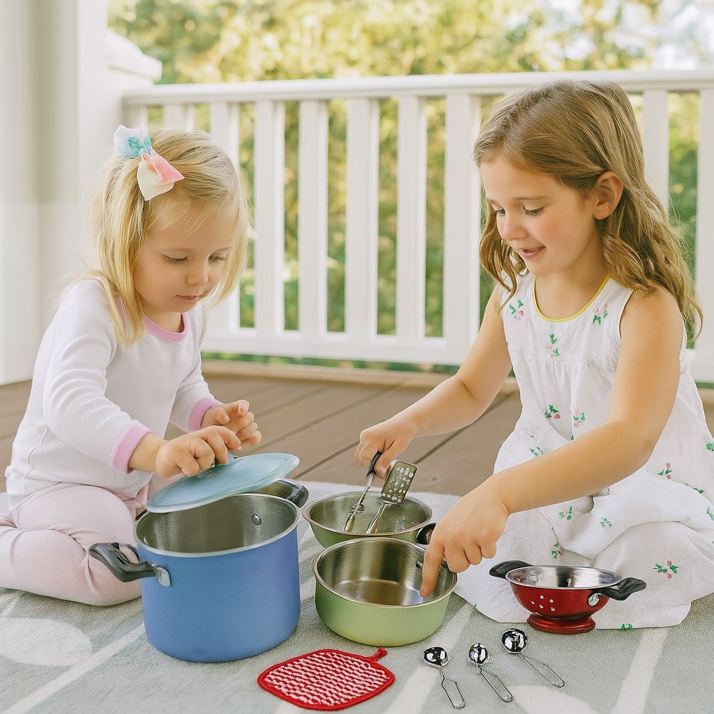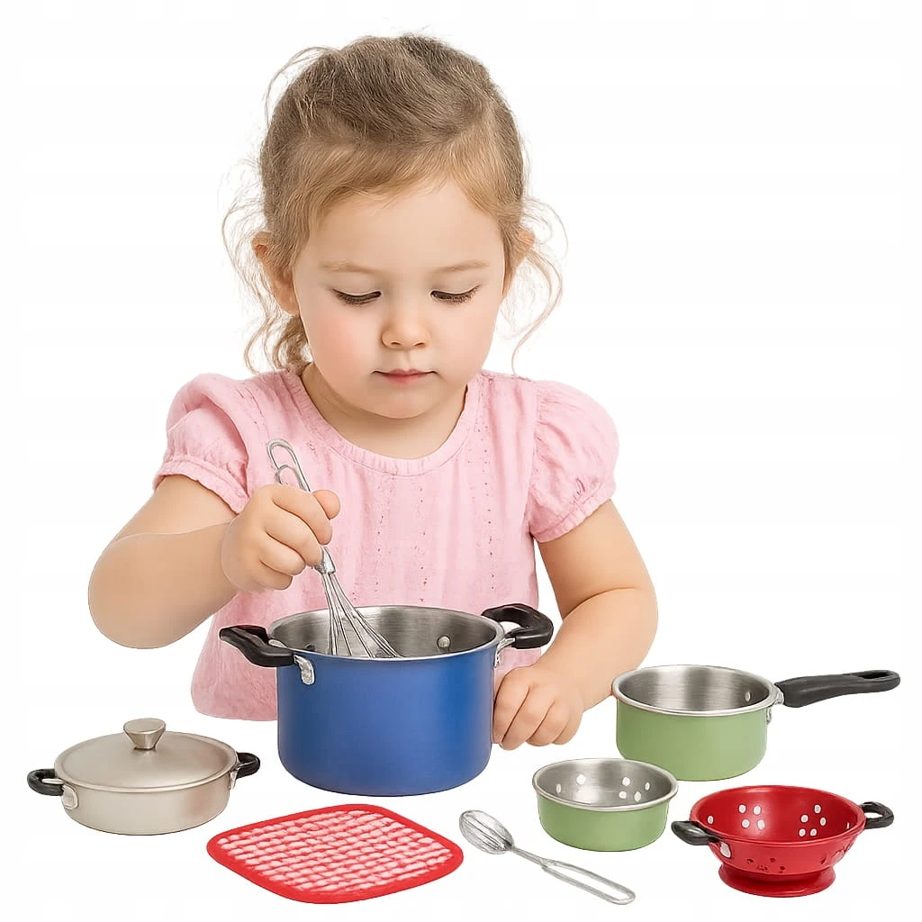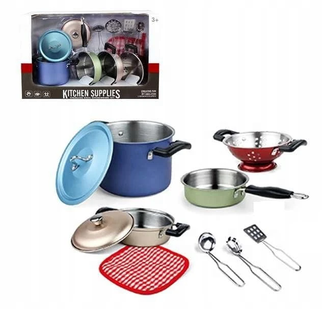 Metalowy zestaw kuchenny dla dzieci - akcesoria kuchenne dla dzieci oraz metalowe garnki o różnej wielkości. Doskonale sprawdzi się podczas zabawy w domu, w gotowanie. Kuchnie dla dzieci z takim wyposażeniem mogą sprawić, że zabawa w gotowanie może stać się pasją dziecka.