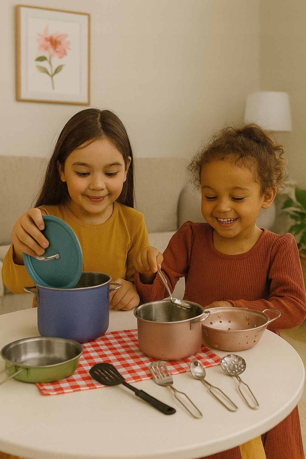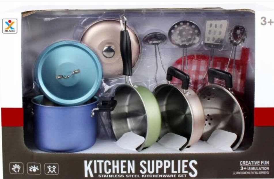 Cały zestaw wykonany jest ze stali nierdzewnej i genialnie imituje prawdziwe garnki kuchenne. Doskonała i długa rozrywka, która łączy zabawę z nauką. Dokładne repliki codziennych przyborów kuchennych, ale w mniejszym rozmiarze z myślą o dzieciach.