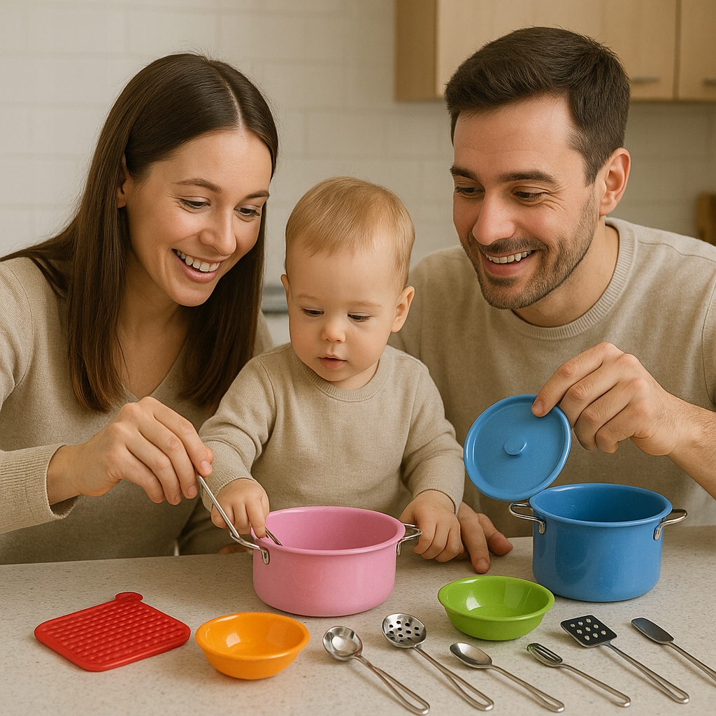 Cały zestaw wykonany jest ze stali nierdzewnej i genialnie imituje prawdziwe garnki kuchenne. Doskonała i długa rozrywka, która łączy zabawę z nauką. Dokładne repliki codziennych przyborów kuchennych, ale w mniejszym rozmiarze z myślą o dzieciach.