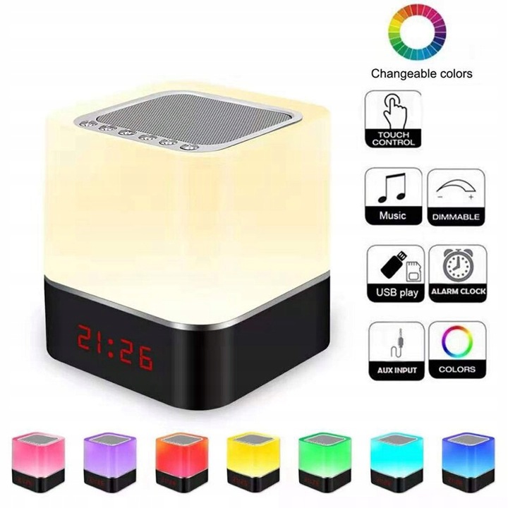 Głośnik Bluetooth LED + Czujnik dotykowy Lampa LED + Budzik + Odtwarzacz MP3 + Zestaw głośnomówiący, kompatybilny ze wszystkimi urządzeniami Bluetooth. Kompatybilny z wejściem pamięci flash i kartą micro SD, wejściem AUX.