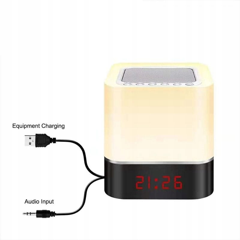Głośnik Bluetooth LED + Czujnik dotykowy Lampa LED + Budzik + Odtwarzacz MP3 + Zestaw głośnomówiący, kompatybilny ze wszystkimi urządzeniami Bluetooth. Kompatybilny z wejściem pamięci flash i kartą micro SD, wejściem AUX.