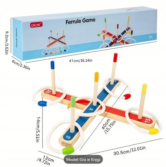 ✅ Rozwój przez zabawę – gra doskonale trenuje koordynację wzrokowo-ruchową, celność, cierpliwość oraz umiejętność skupienia uwagi. ✅ Nauka liczenia – dzięki punktom namalowanym na podstawie (od 10 do 30 pkt), dzieci w naturalny sposób ćwiczą dodawanie w pamięci podczas sumowania wyników. ✅ Wysoka jakość wykonania – zestaw wykonany jest z naturalnego drewna, co czyni go trwałym i ekologicznym. Solidna konstrukcja „krzyżaka” zapewnia stabilność podczas rzutów. ✅ Uniwersalność – idealna do zabawy wewnątrz (nie rysuje podłóg, lekkie obręcze są bezpieczne dla mebli) oraz na zewnątrz (trawa, piasek, taras). ✅ Łatwy montaż – złożenie gry zajmuje dosłownie chwilę i nie wymaga użycia narzędzi. Po skończonej zabawie łatwo ją rozłożyć i schować.