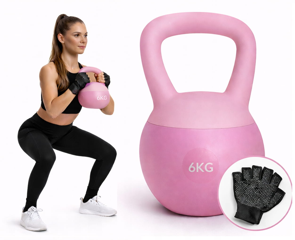 KETTLEBELL 6 kg miękki ketle kula hantla FITNESS trening w domu różowy + gratis rękawiczki