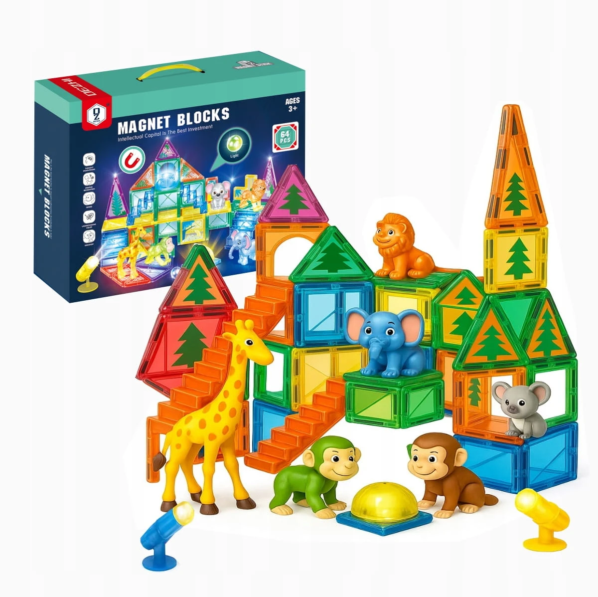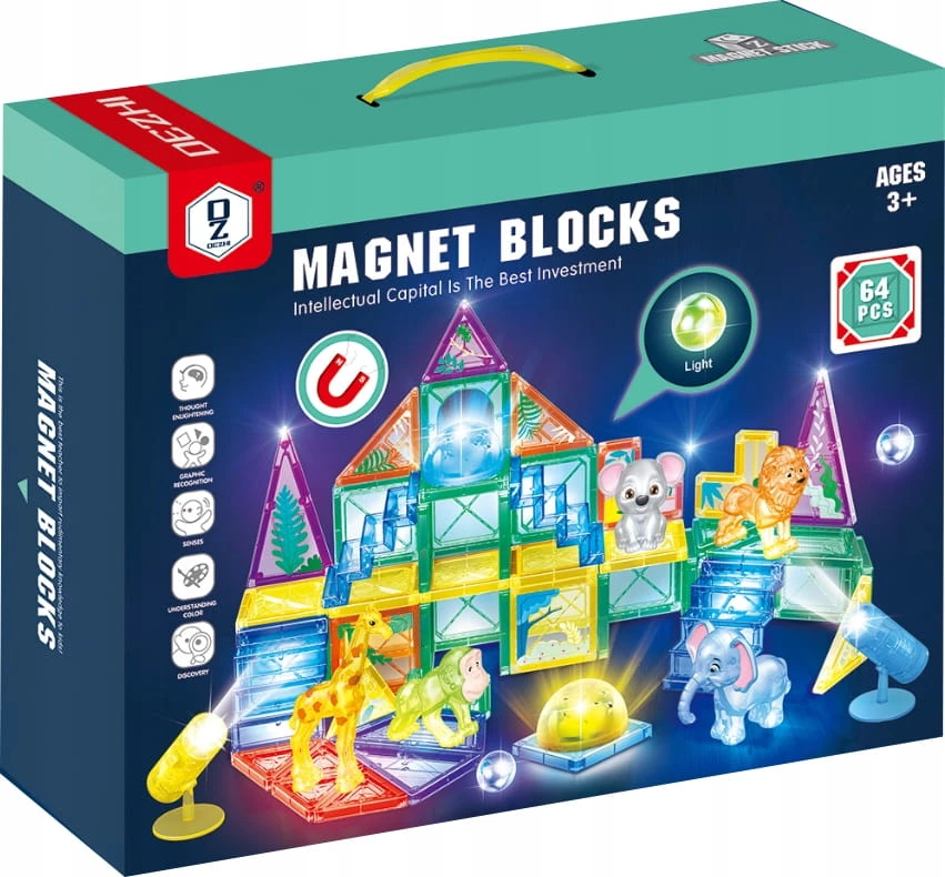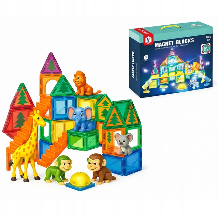 KLOCKI MAGNETYCZNE 3D ŚWIECĄCE LED Konstrukcyjna Układanka Edukacyjna 64 el