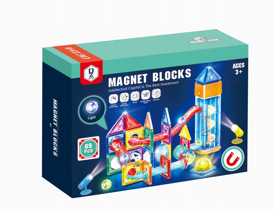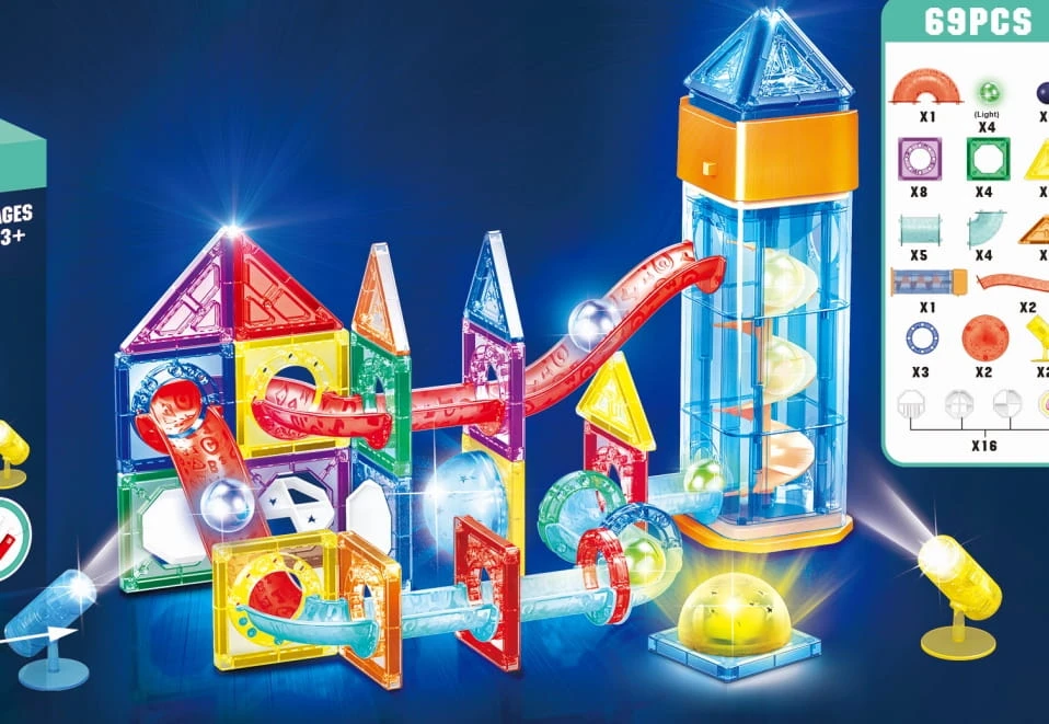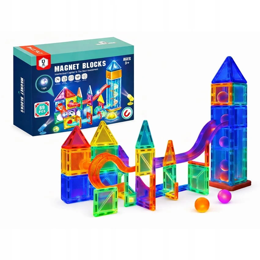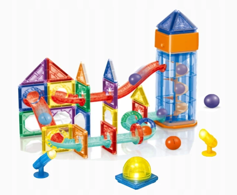 KLOCKI MAGNETYCZNE 69el. TOR KULKOWY ŚWIECĄCY KULODROM EDUKACYJNY 3D LED