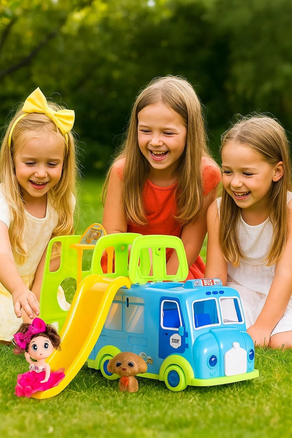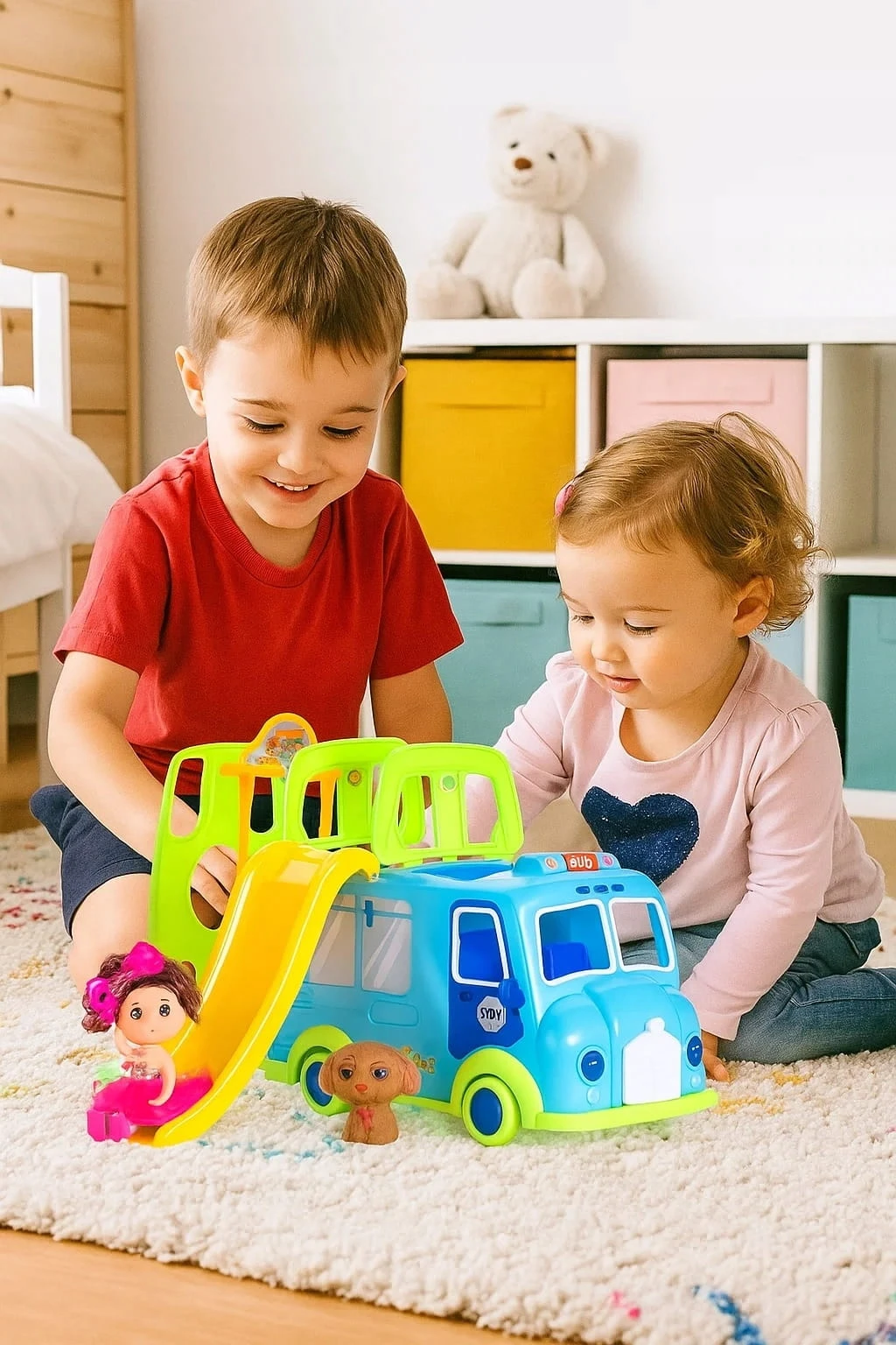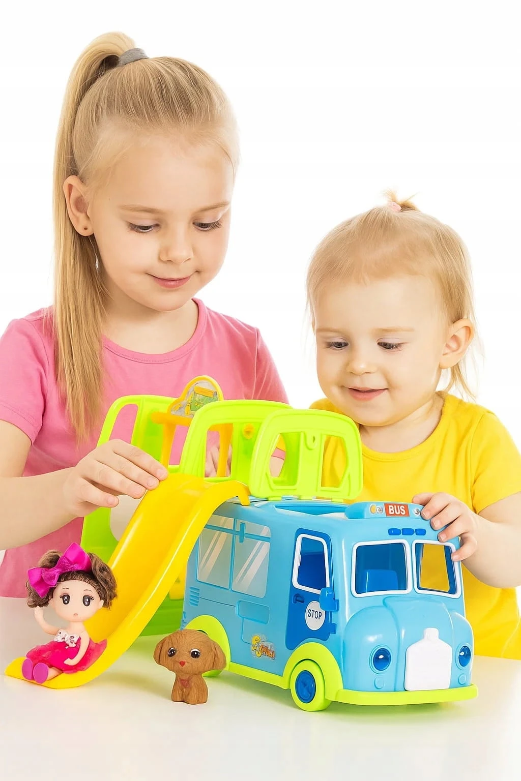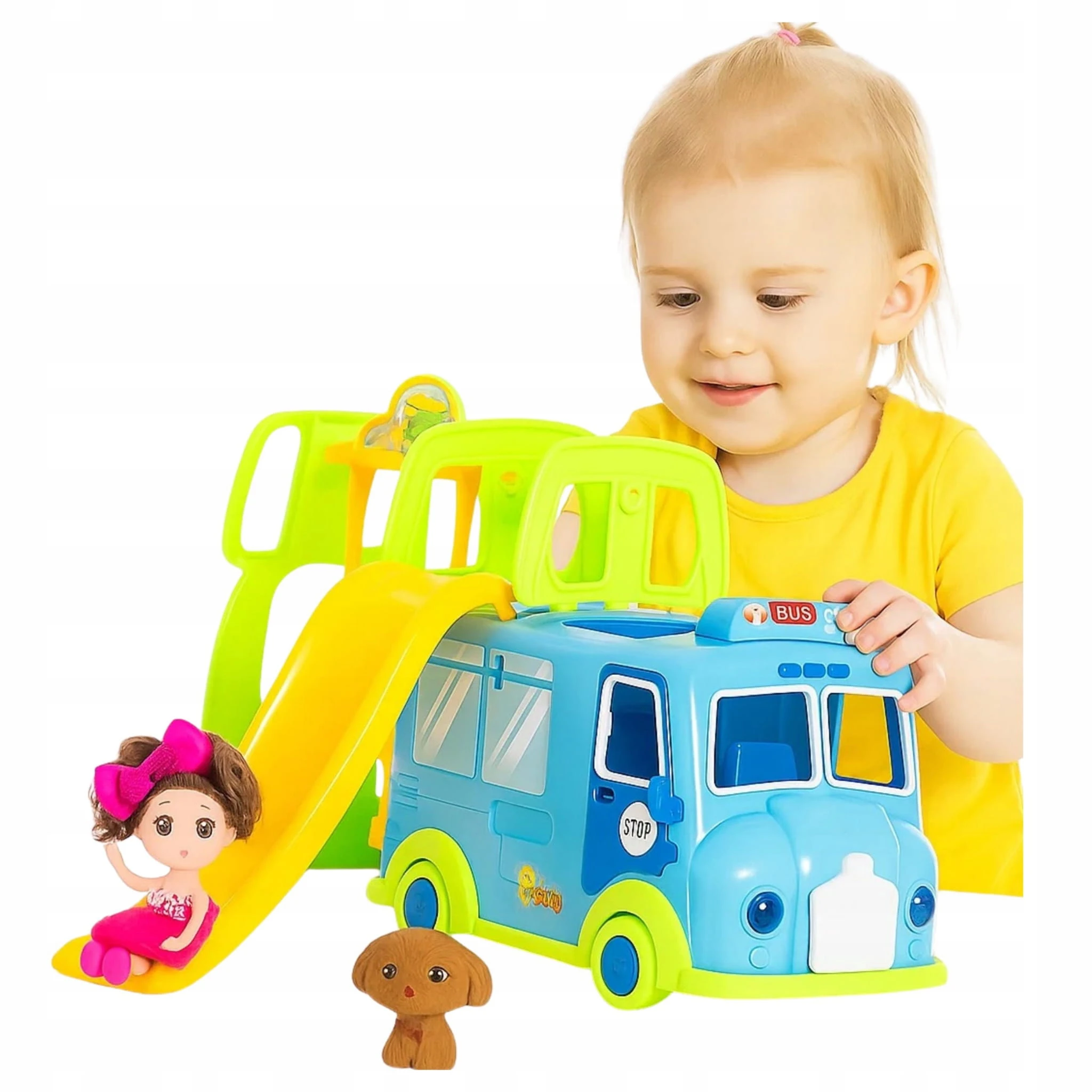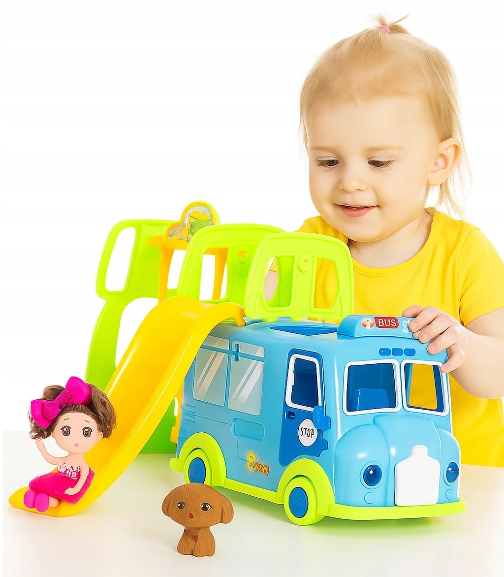 Kolorowy Bus z Zjeżdżalnią + Lalka i Piesek – Zestaw Zabawowy dla Dzieci