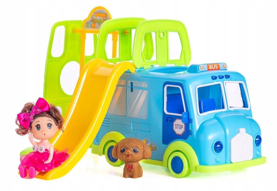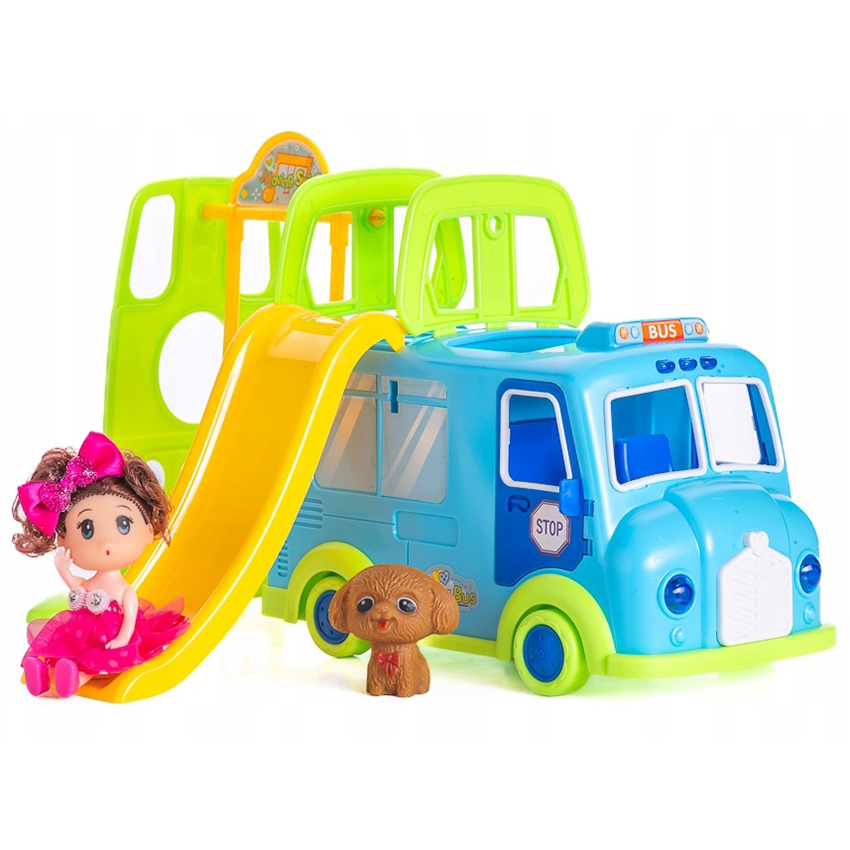 Autobus pełni rolę mini placu zabaw – posiada zjeżdżalnię i kolorowe elementy zachęcające do wspólnej zabawy laleczki i pieska.