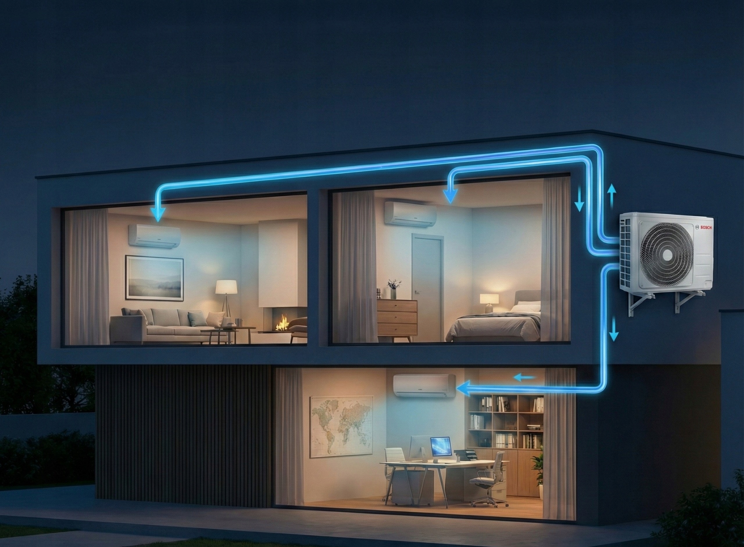Szukasz niezawodnego sposobu na idealną temperaturę w całym domu bez szpecenia elewacji kilkoma urządzeniami? Agregat Bosch Climate 5000 MS o potężnej mocy 7,9 kW obsłuży aż trzy klimatyzatory naraz, gwarantując przyjemną ulgę w upalne dni i tanie ogrzewanie zimą.