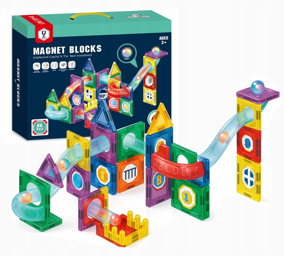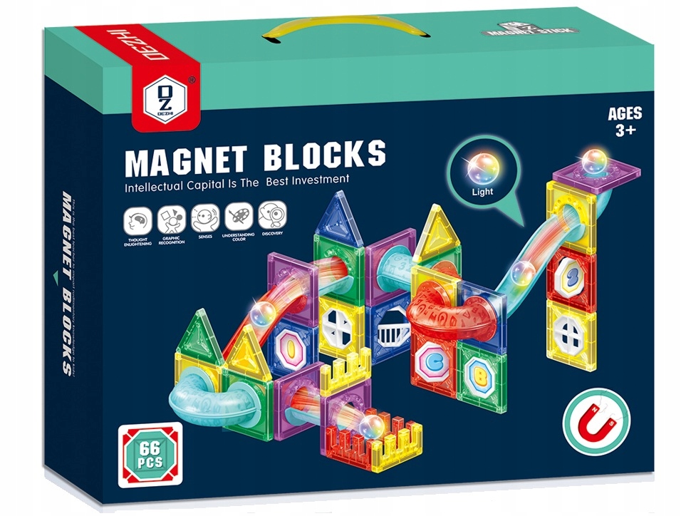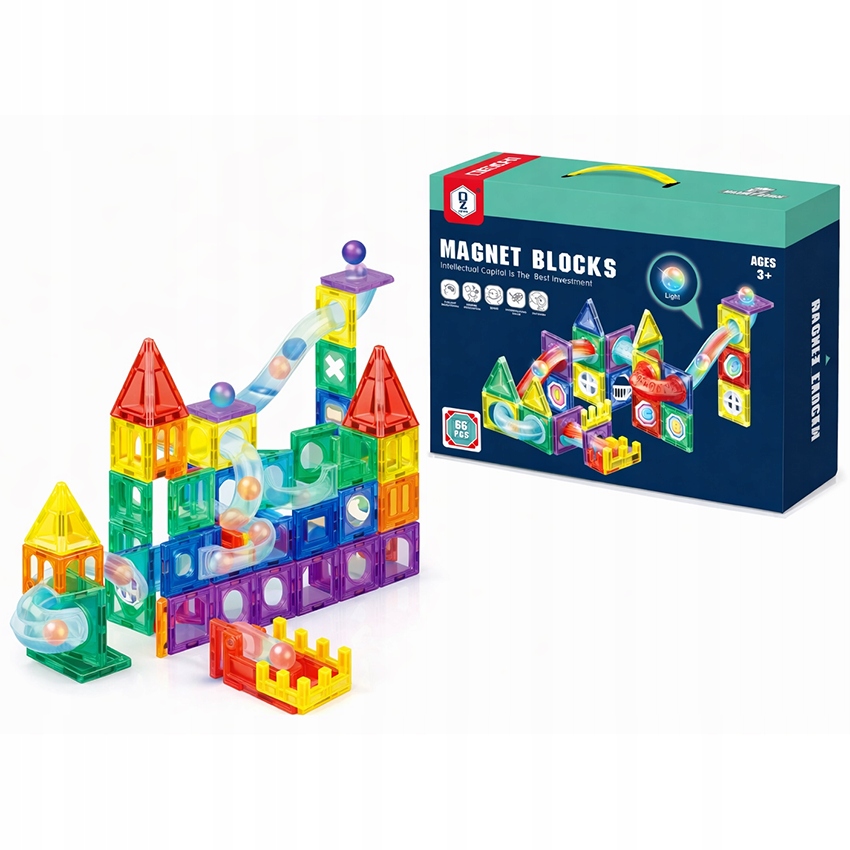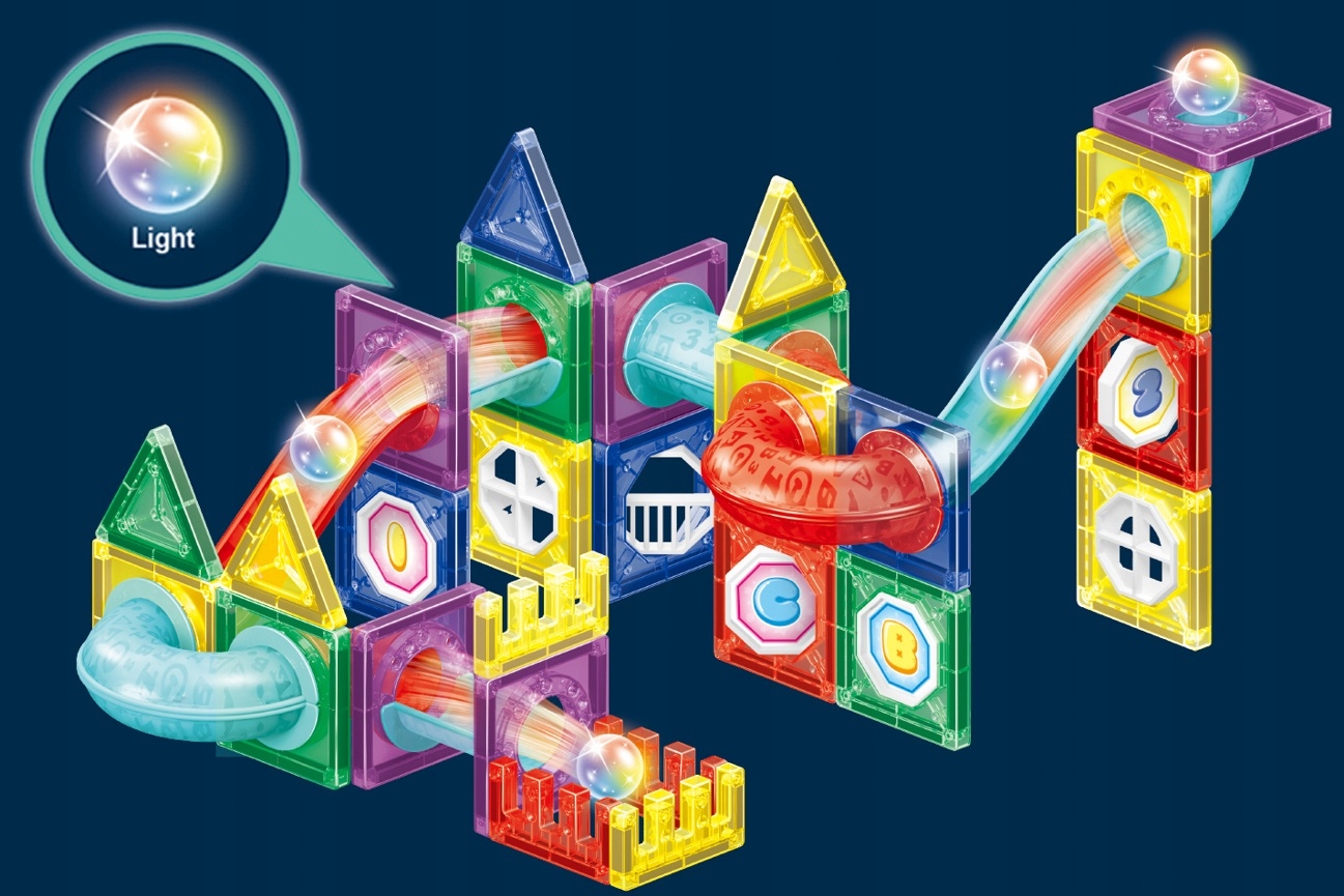 Klocki Magnetyczne Tor Kulkowy Kulodrom Świecący LED Zestaw 3D 66 el.
