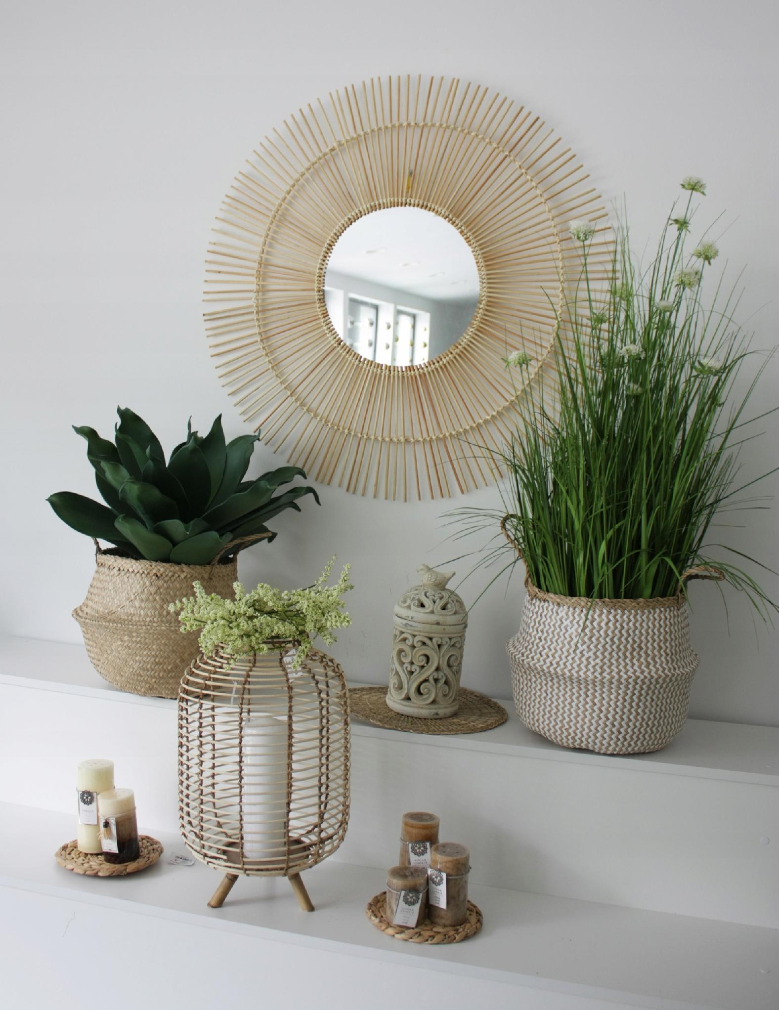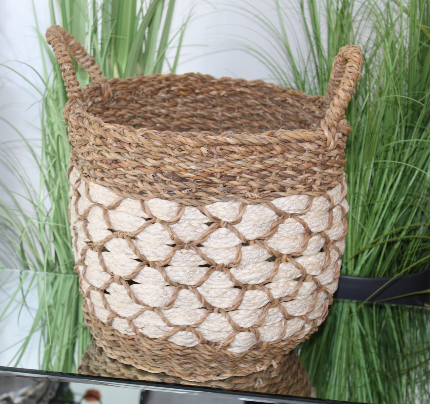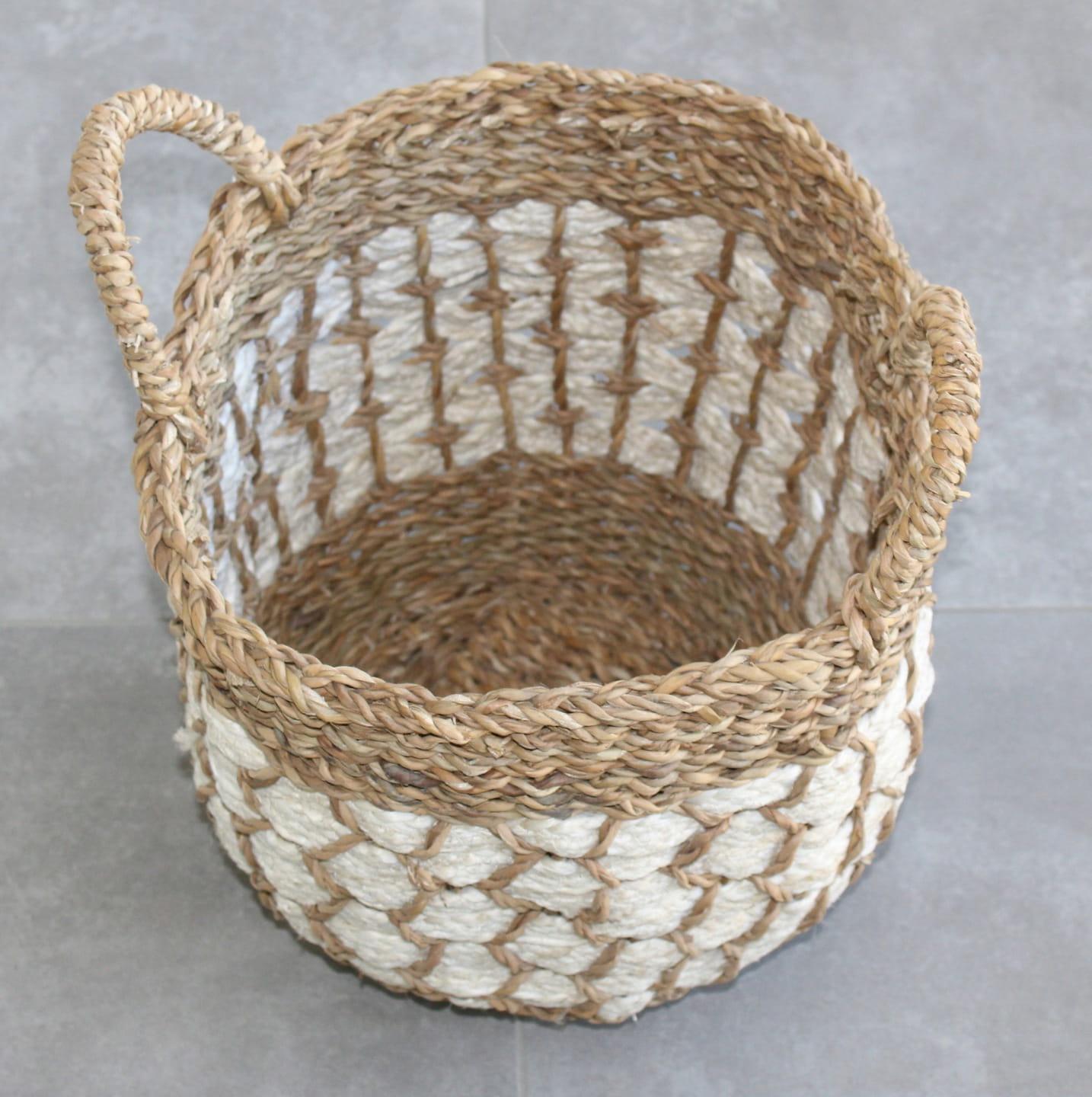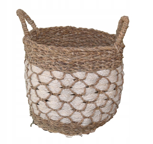Dekoracyjny kosz pleciony ręcznie z uszami, o naturalnej kolorystyce, opleciony czarnym sznurem.