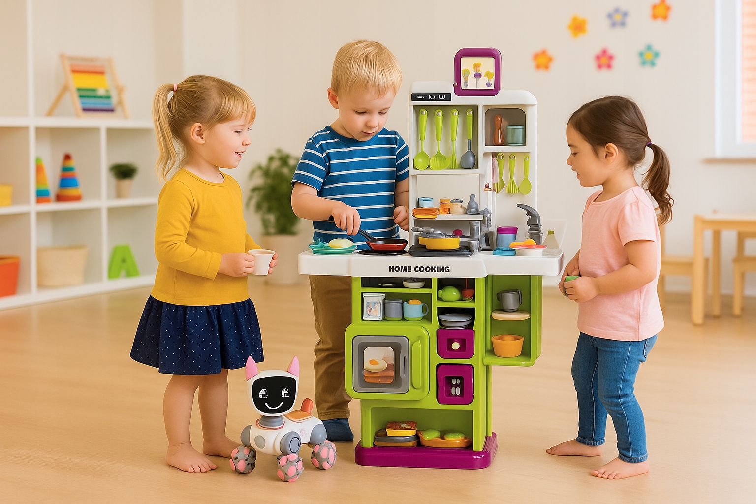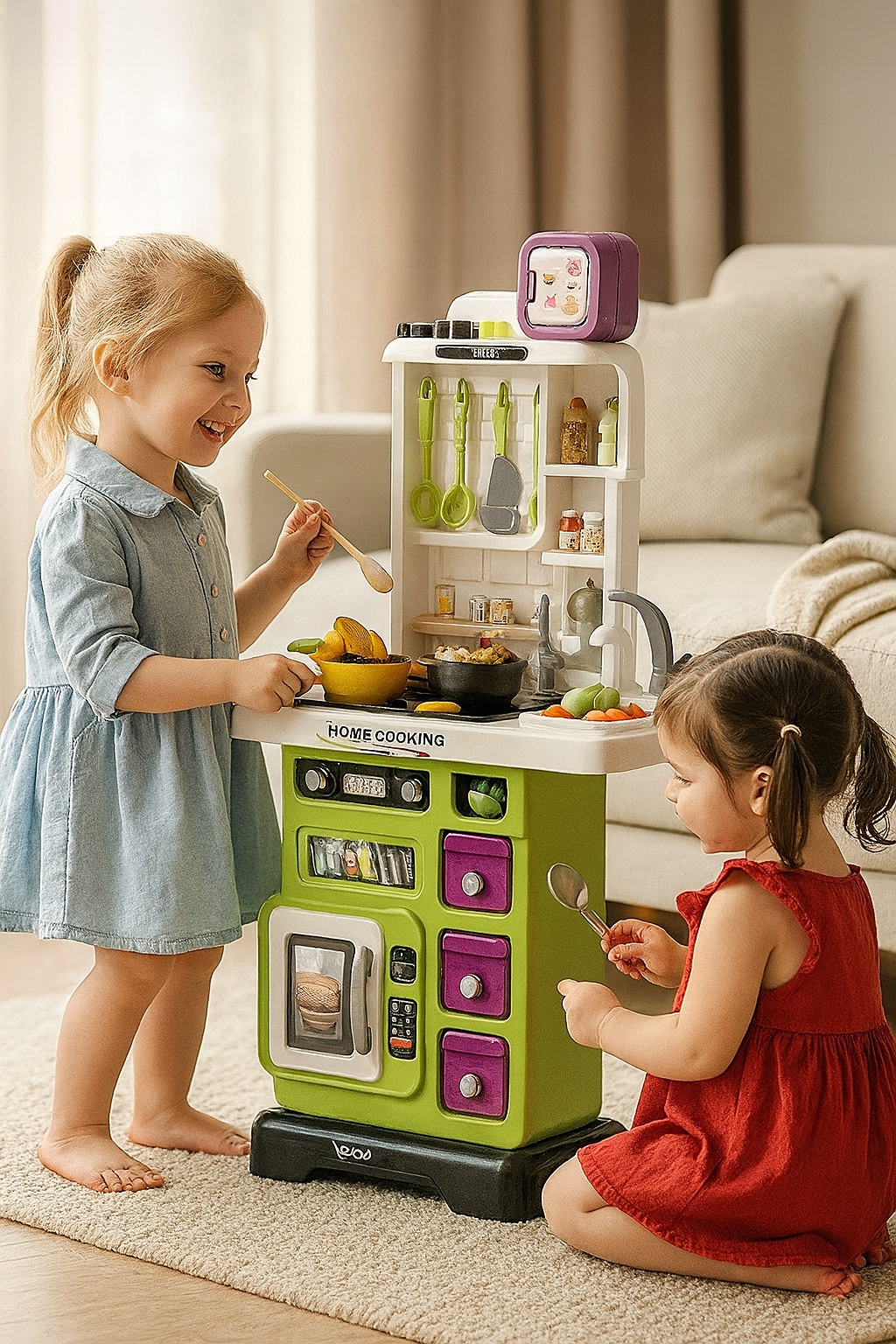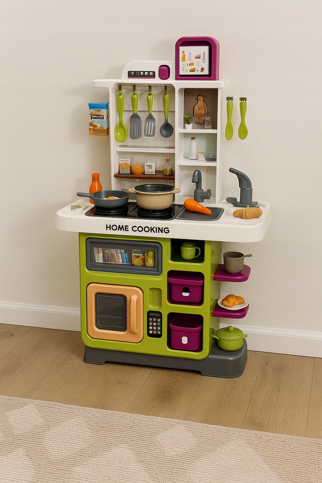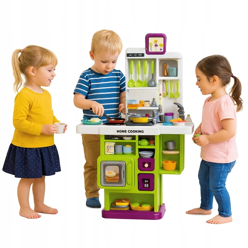 Rewelacyjna, bogato wyposażona, duża multifunkcyjna kuchnia dla dzieci powyżej 3-go roku życia. Kuchnia posiada zlew z kranem, z którego leje się woda, podświetlane palniki z odgłosami gotowania i smażenia, jeden z palników posiada funkcję wytwarzania pary wodnej, ruchome pokrętła, otwierany piekarnik, zegar z ruchomymi wskazówkami, półeczki i liczne akcesoria kuchenne (65 elementy). Zestaw zasilany jest bateriami typu 3 x AA 1,5 V (brak w zestawie).