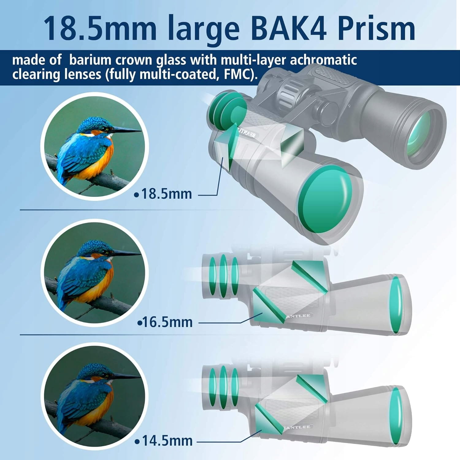 Nasze lornetki dla dorosłych wykorzystują pryzmat BAK4 o grubości 18,5 mm o wysokiej przepuszczalności światła, skutecznie unikając utraty światła i czarnych krawędzi. Można uzyskać wyraźniejsze i jaśniejsze obrazy. Inne lornetki wykorzystujące pryzmaty BK7 mają niską przepuszczalność światła, ciemne efekty uboczne i słabe obrazowanie.