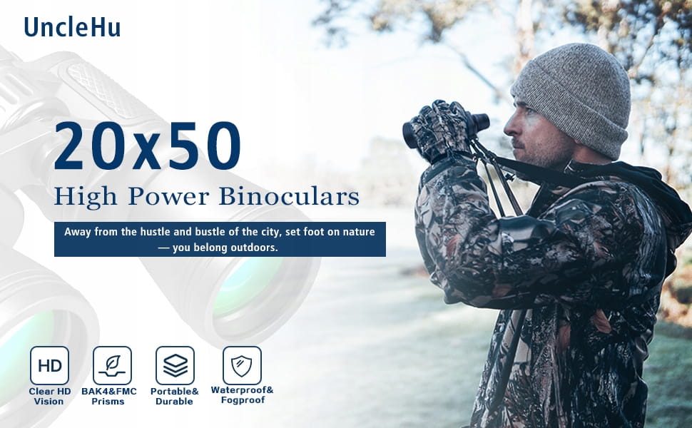 UncleHu® Lornetka o wysokiej wydajności 20 x 50 dla dorosłych, w słabym świetle, kompaktowa, wodoszczelna, do obserwacji ptaków, gwiazd, polowania, podróży, meczów piłki nożnej, z torbą i paskiem