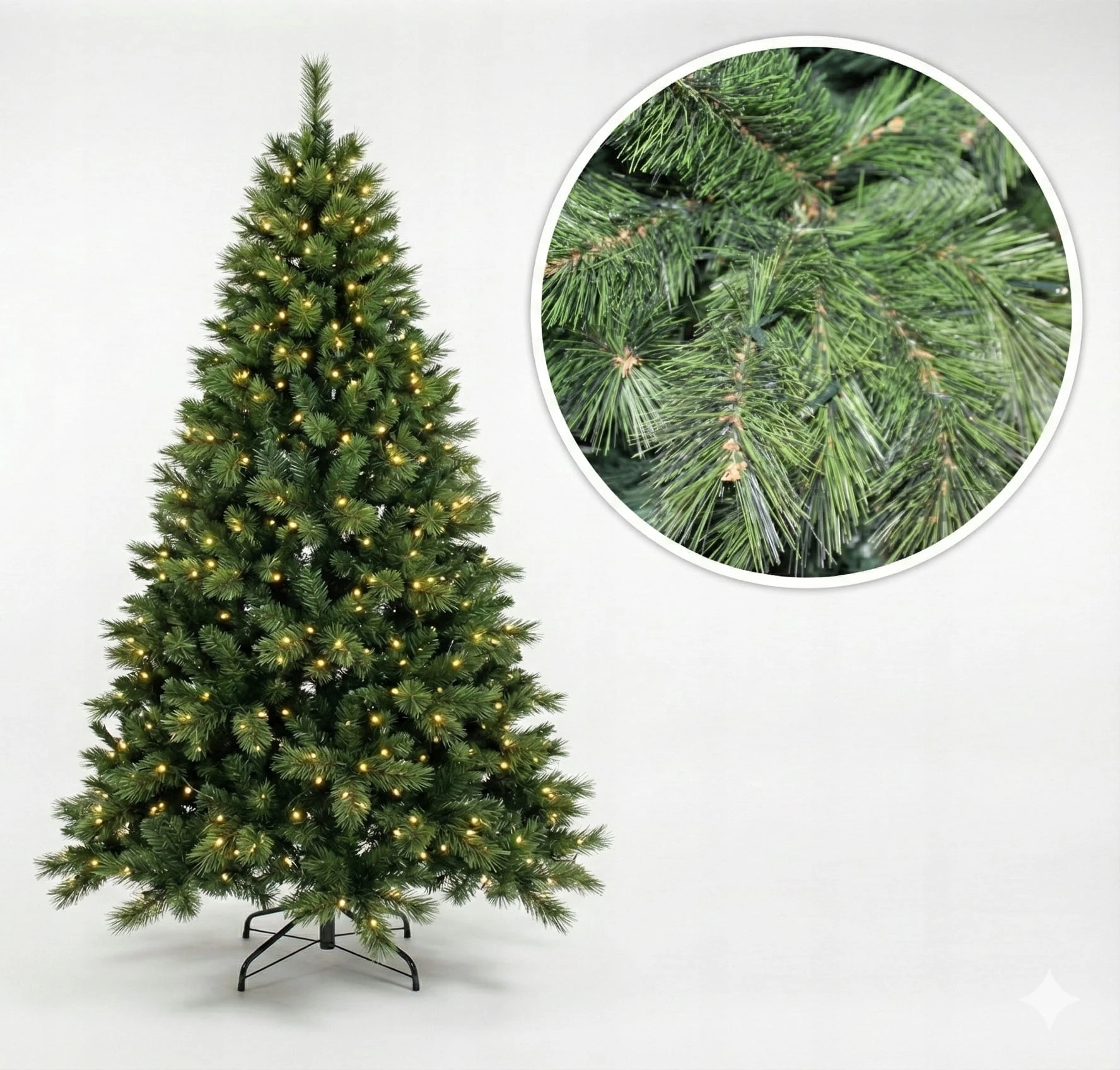 Gałązki wykonane z mieszanki wysokiej jakości tworzyw perfekcyjnie imitują prawdziwą sosnę. Drzewko jest tak gęste, że wygląda, jakby dopiero co zostało ścięte!