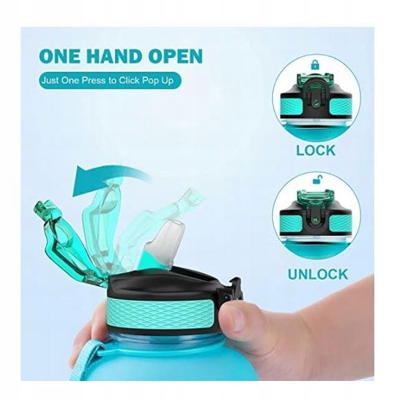Szczelna pokrywka wyposażona jest również w bezpieczne zamknięcie, aby woda była świeża. Nie musisz podnosić butelki. Miękka, trwała słomka silikonowa zapewnia szczelne picie oraz szybki przepływ wody. Wytrzymały pasek na rękę i antypoślizgowy uchwyt ułatwiają przenoszenie butelki w dowolne miejsce. Idealnie nadaje się na wędrówki, kemping, jogę, do biegania lub uprawiania każdego innego rodzaju sportu.