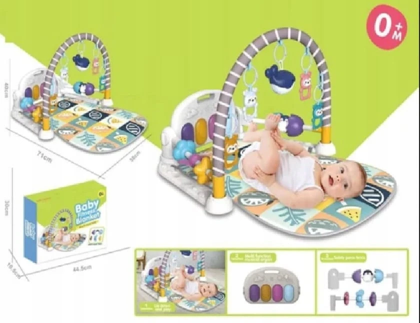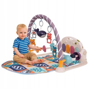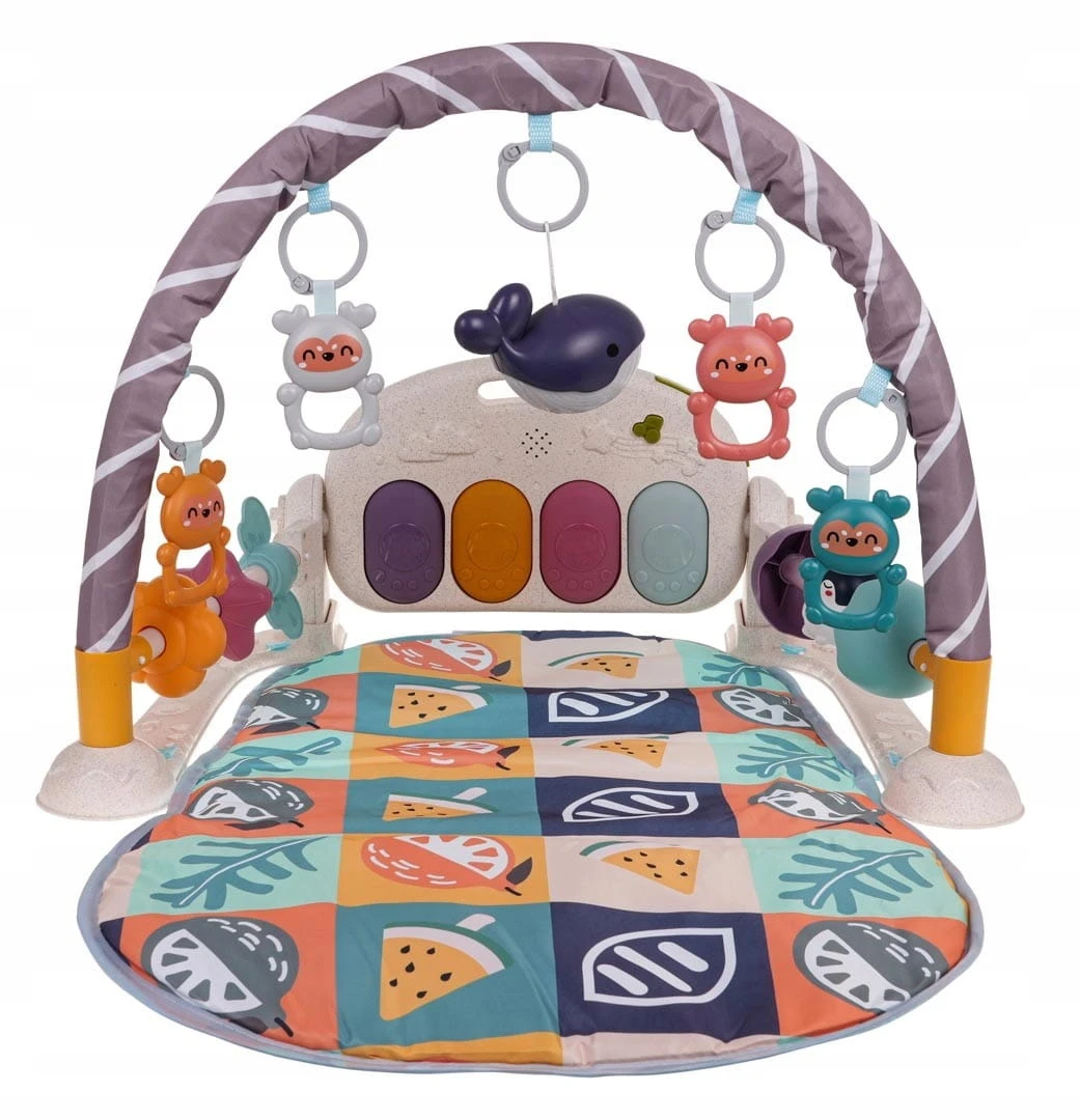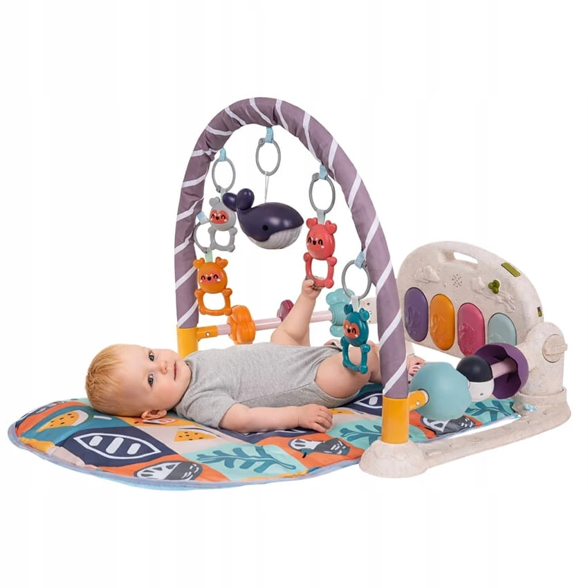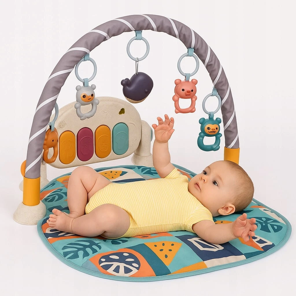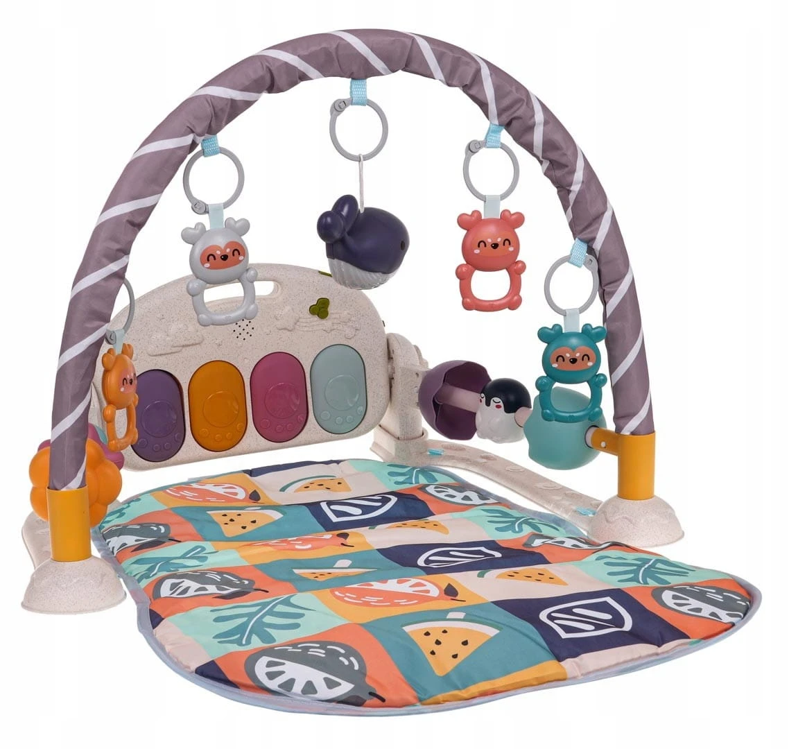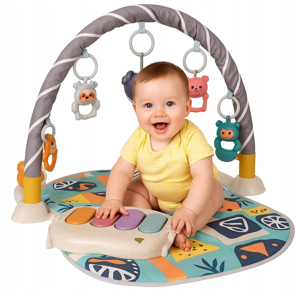 Mata do zabawy dla dzieci zawiera pięć uroczych odczepianych wiszących zabawek oraz pianino z czterema klawiszami i efektami świetlnymi.