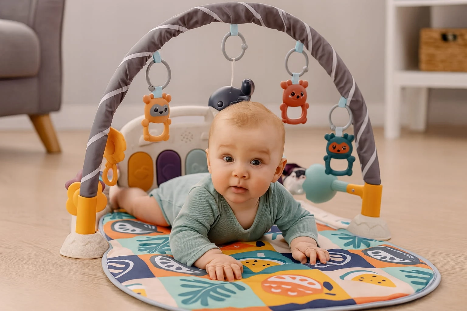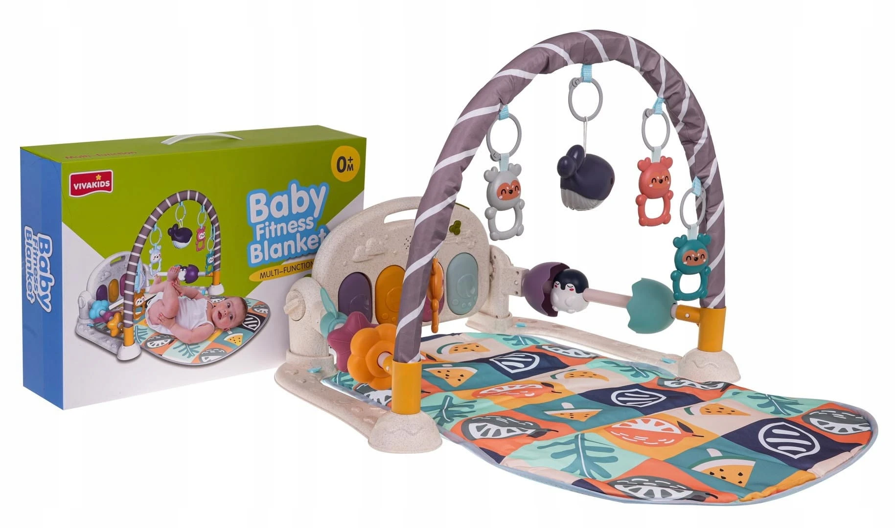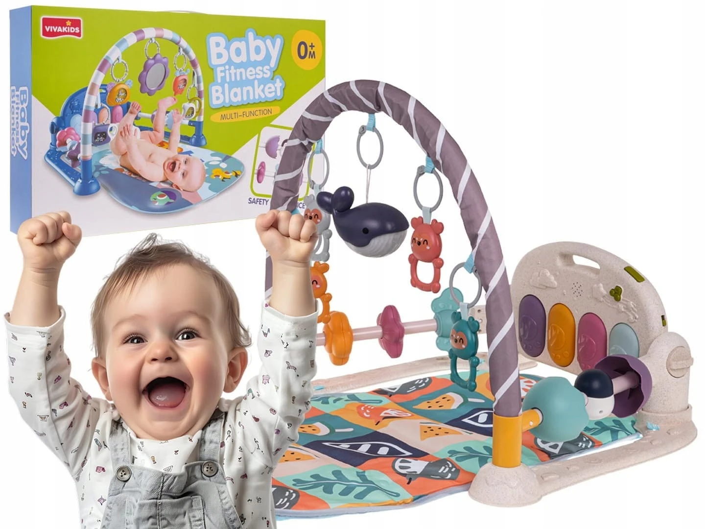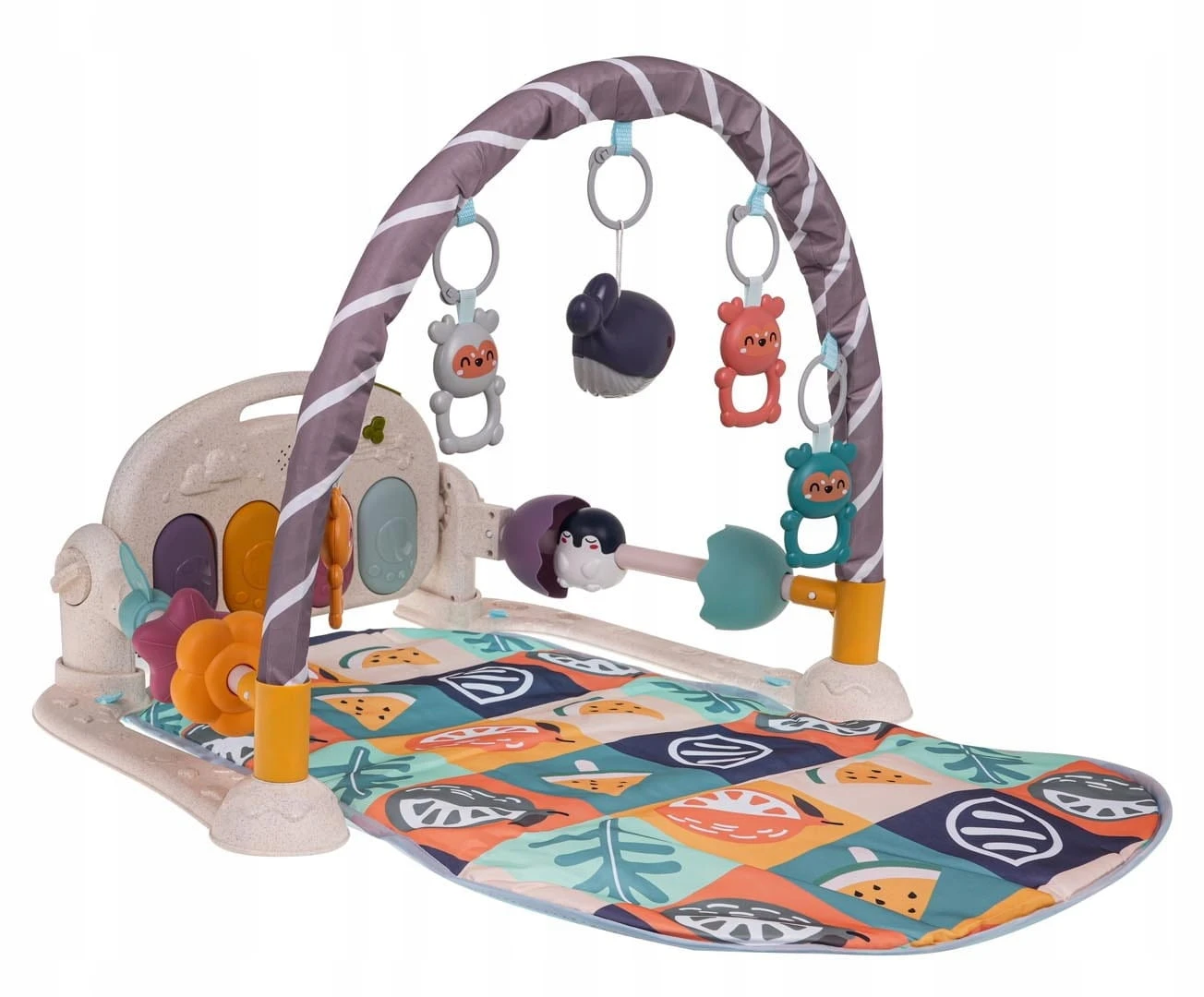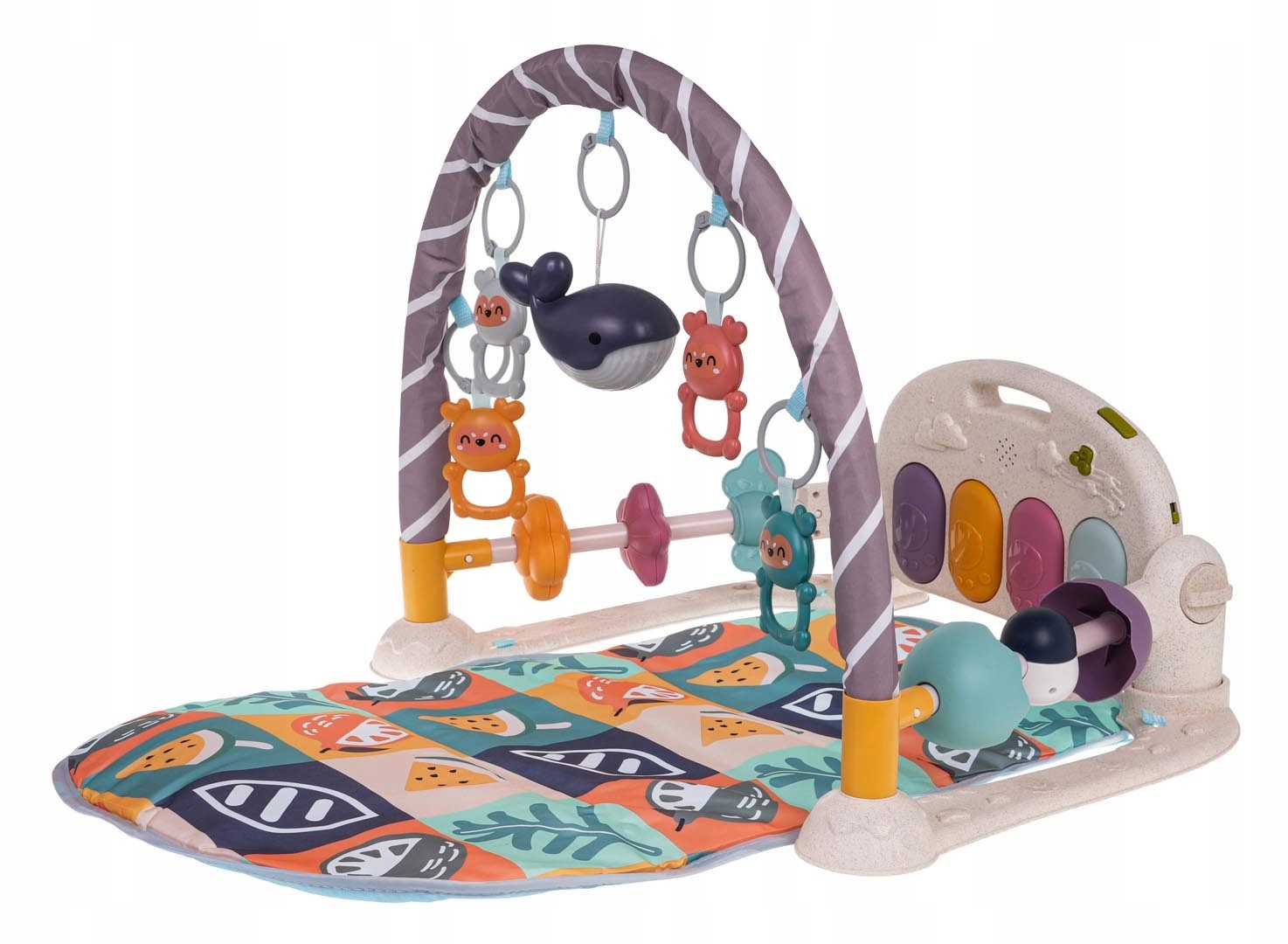 Mata do zabawy dla dzieci zawiera pięć uroczych odczepianych wiszących zabawek oraz pianino z czterema klawiszami i efektami świetlnymi.