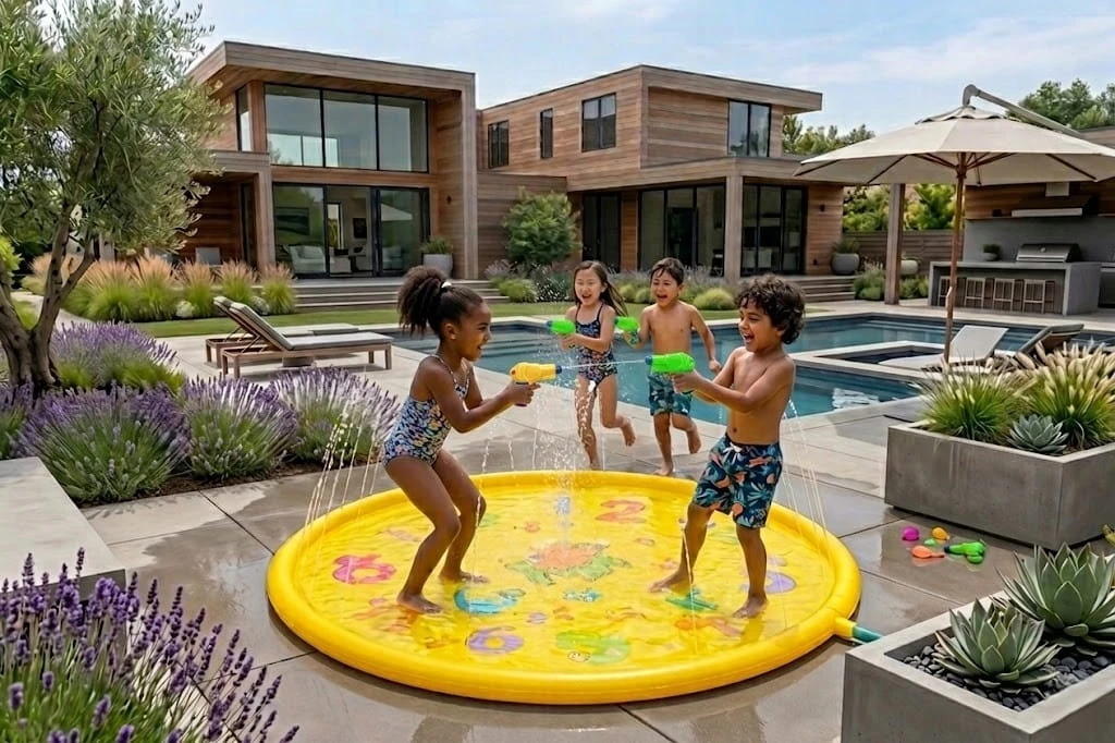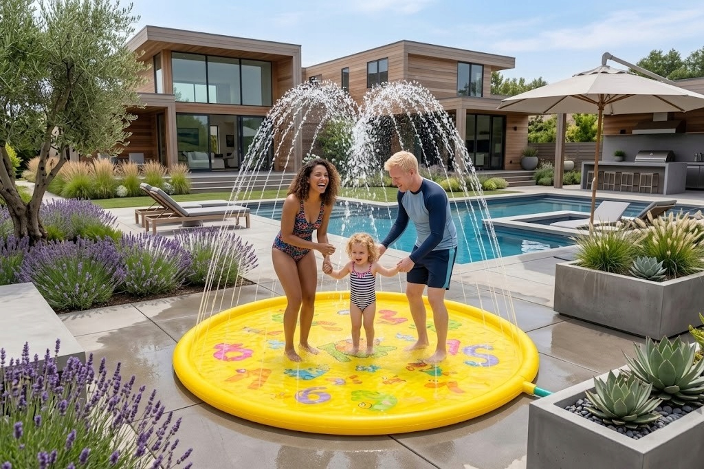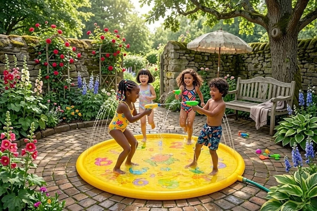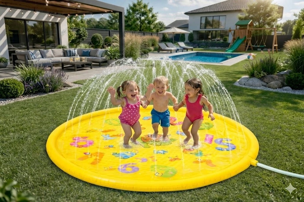 ➡️ woda tryska wokół maty, tworząc bezpieczną i radosną zabawę