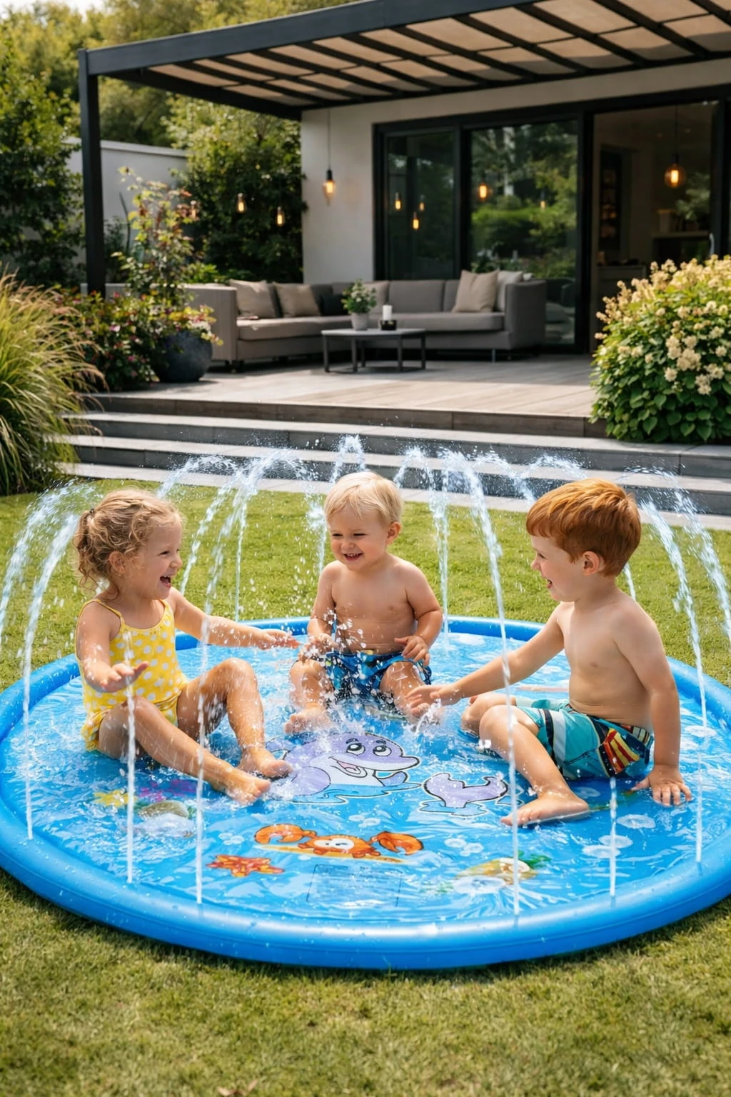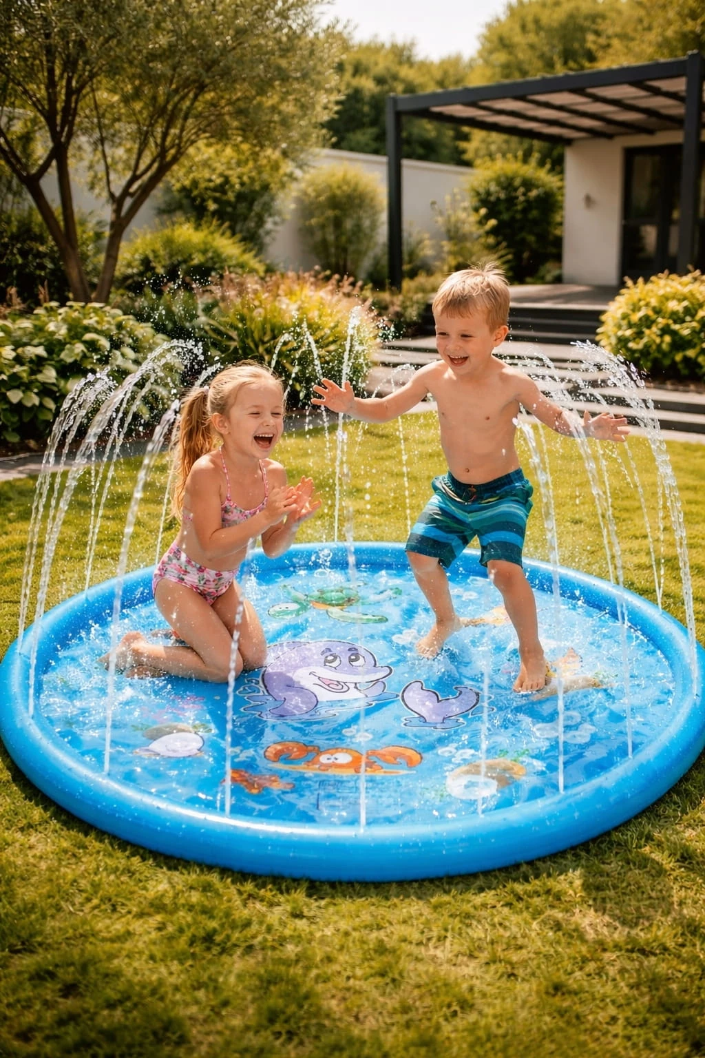 ➡️ woda tryska wokół maty, tworząc bezpieczną i radosną zabawę