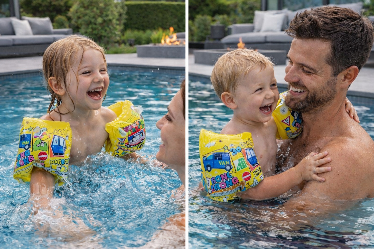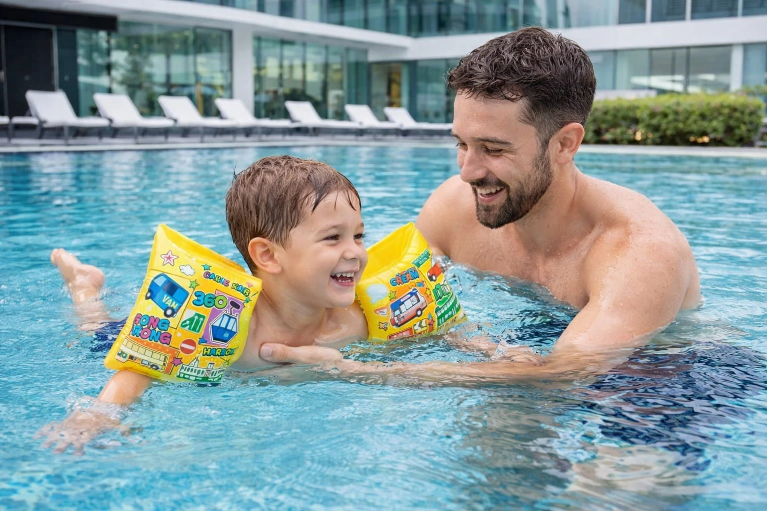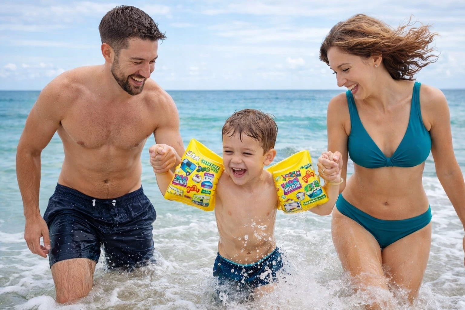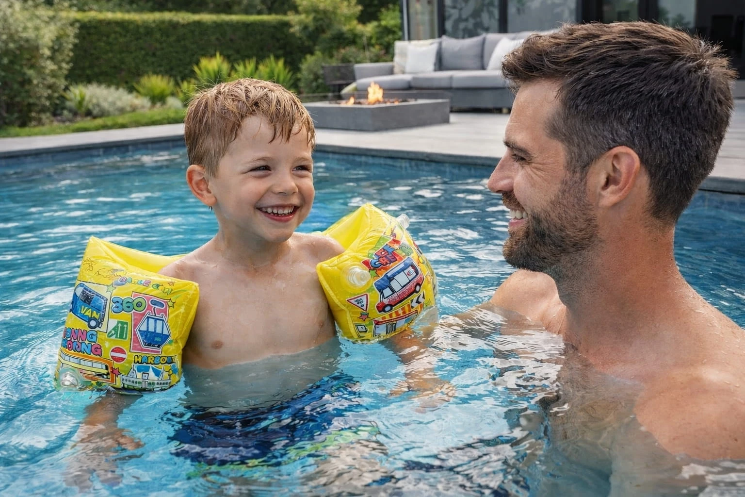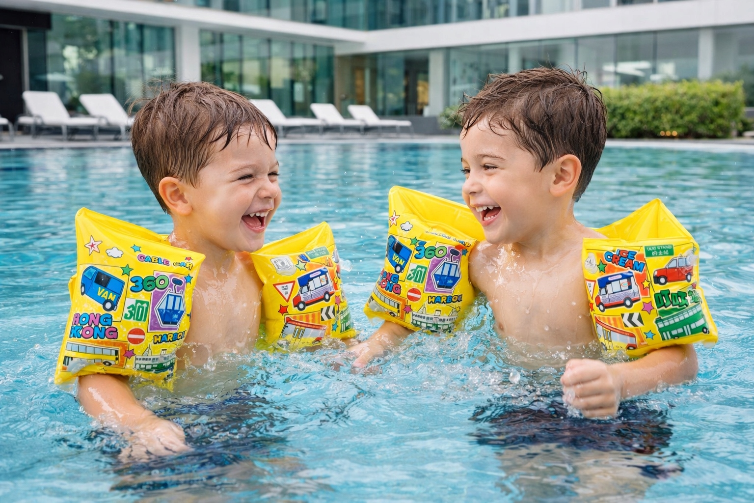 Wesoły motyw z pojazdami zachęca maluchy do zabawy w wodzie i pomaga oswoić się z pływaniem.