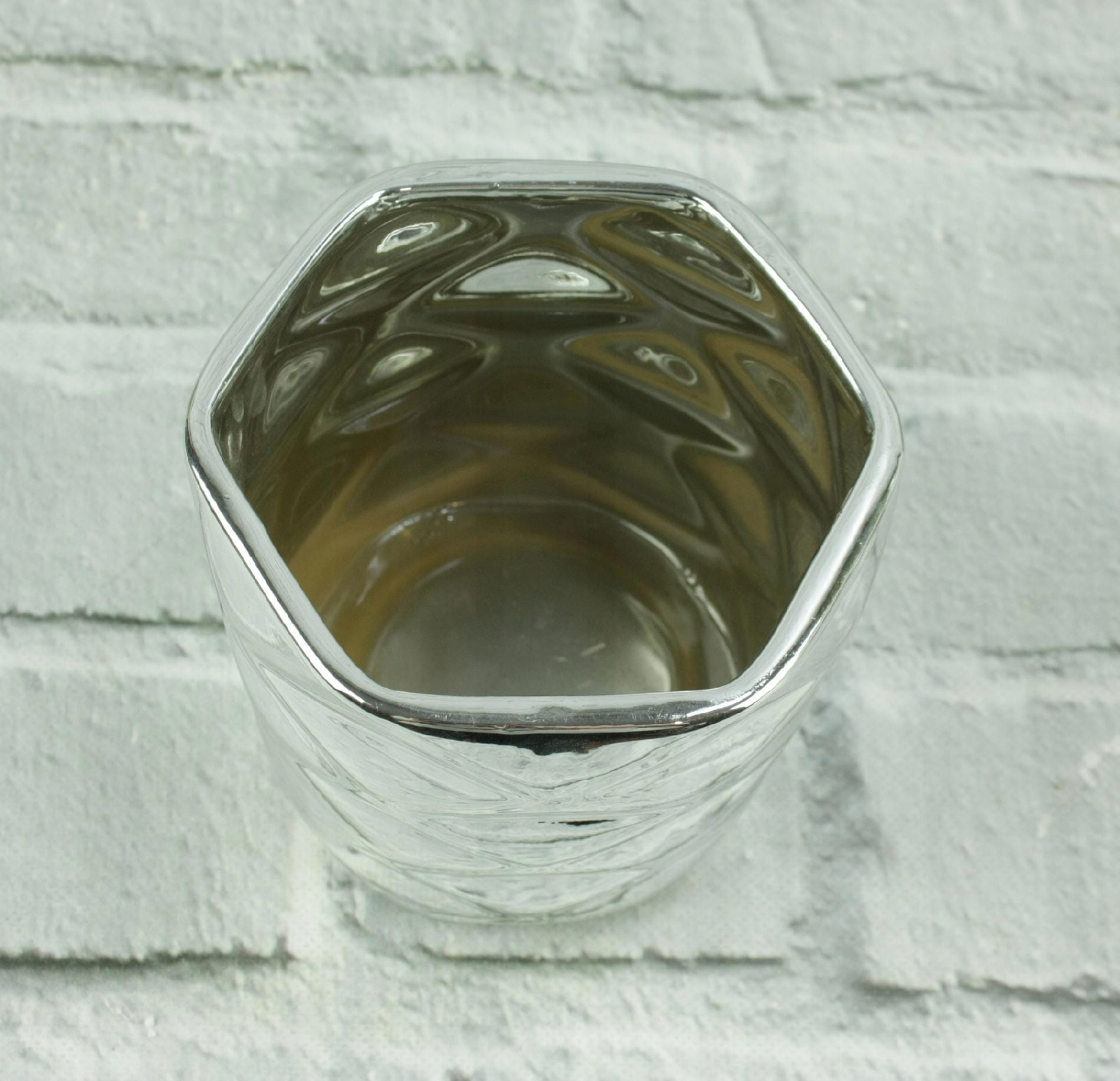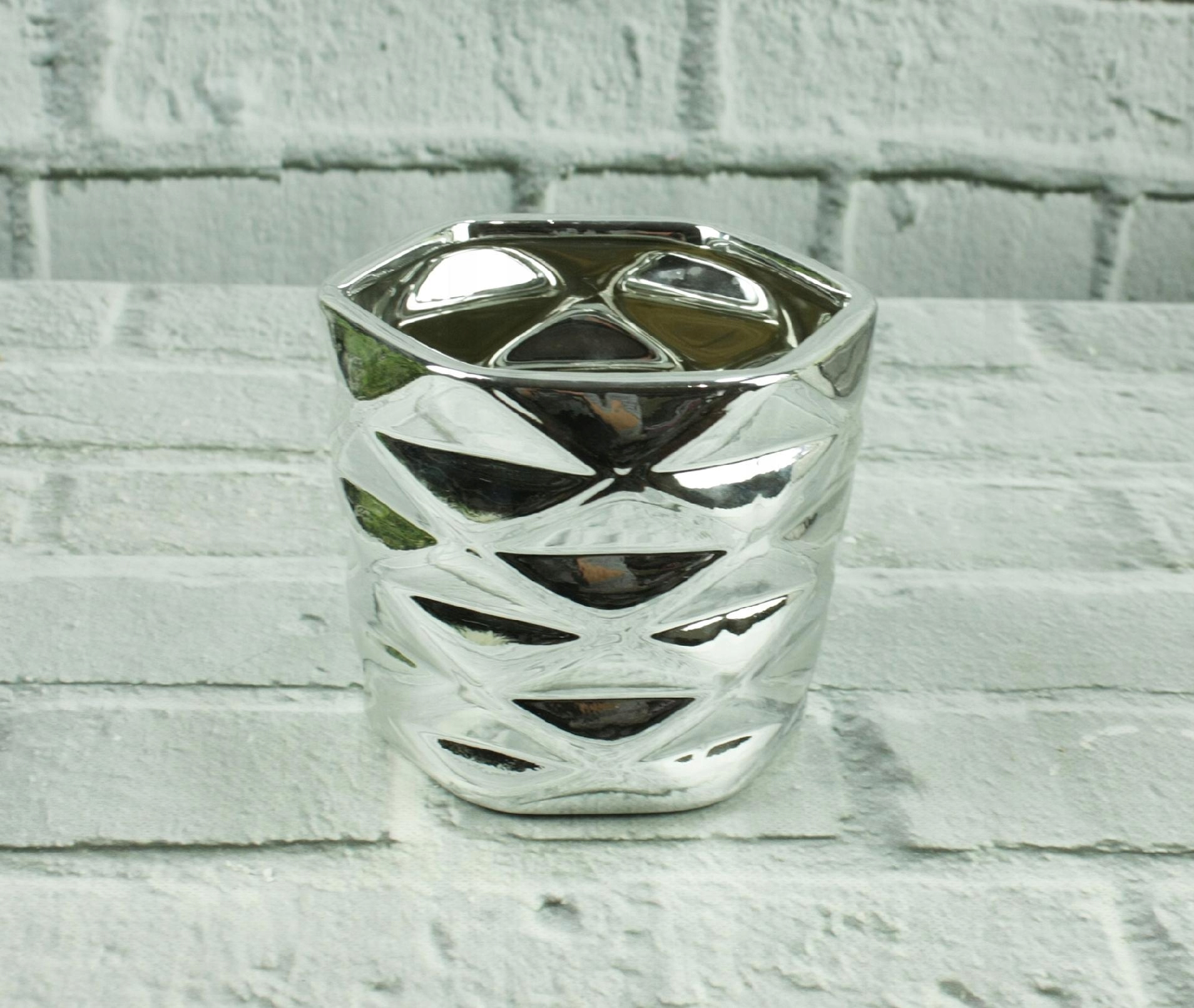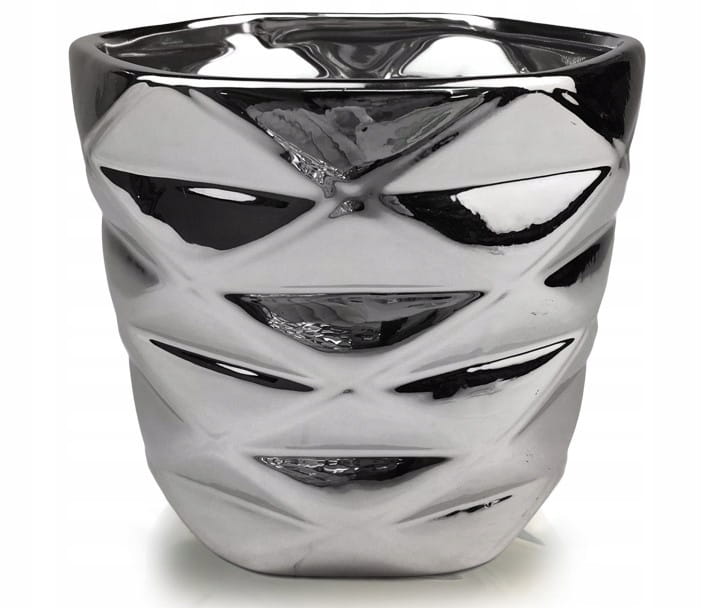Doniczka – osłonka z ceramiki w kolorze srebrnym -sześciokąt.