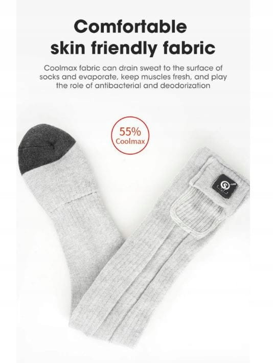 Te podgrzewane skarpetki wykonane są z 75% poliestru, 15% elastanu i 10% nylonu. Chłonne, oddychające, szybko schnące, elastyczne, pogrubione, z elektrycznymi modułami. Miękko wyściełane, wzmocnione pięty i palce oraz zagłębiony element grzewczy pomagają skupić ciepło w palcach, aby stopy nie wyziębiły się.