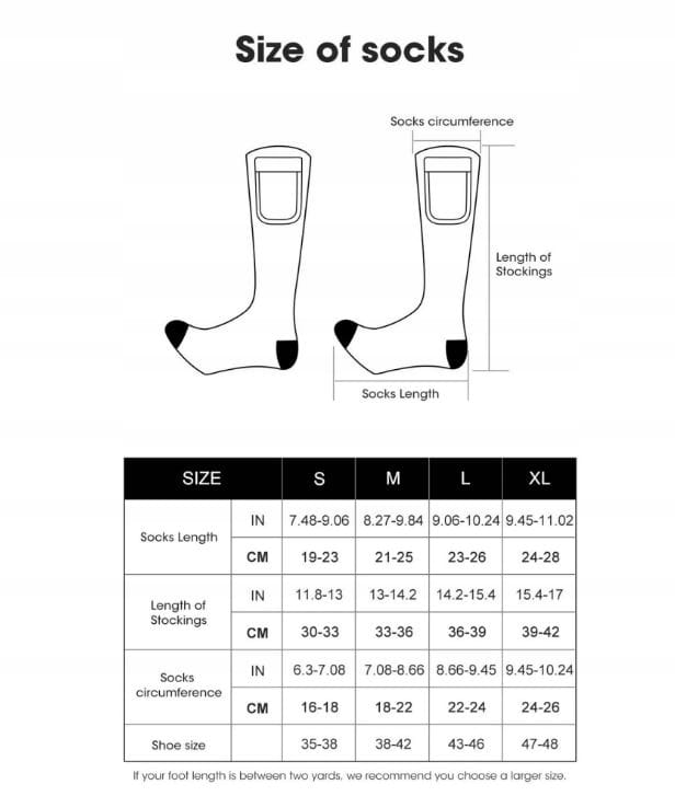 Ciepłe skarpetki dla mężczyzn i kobiet w różnych rozmiarach S, M, L, XL, cztery rozmiary do wyboru. Wybierz rozmiar zgodnie z naszą tabelą rozmiarów, jak pokazano na zdjęciu.