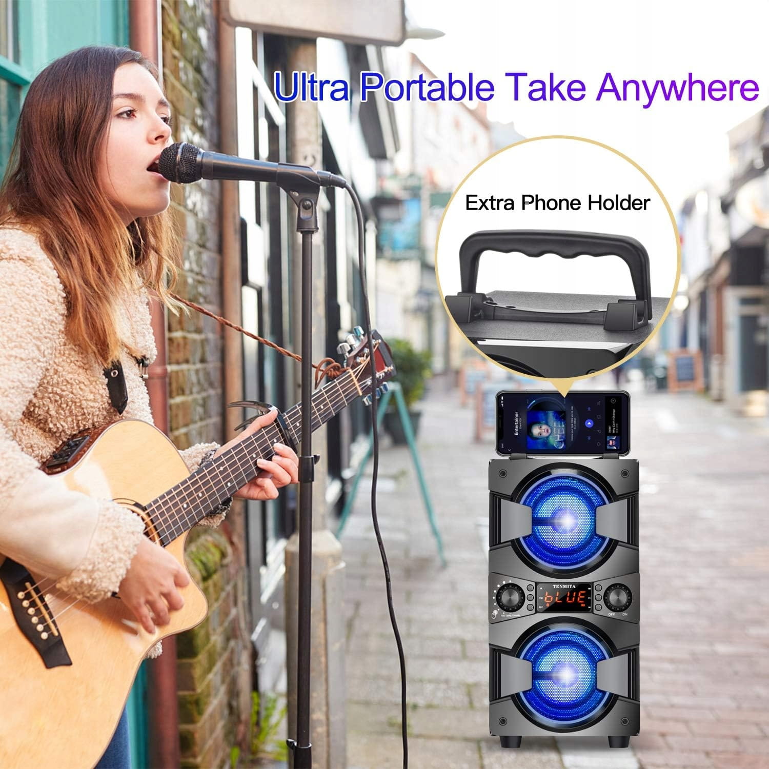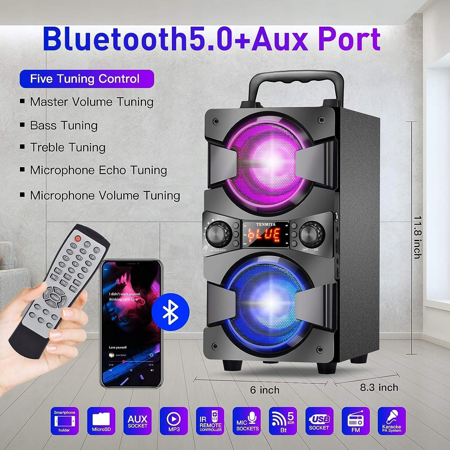 - Maszyna do karaoke - system PA - drewniana konstrukcja wnęki jest nie tylko wytrzymała, ale także może pochłaniać hałas, aby muzyka była lepiej i wyraźniejsza. Posiada możliwość dostosowania korektora do Twoich preferencji. Wygodny uchwyt na górze sprawia, że ten głośnik o idealnej wielkości jest łatwy do przenoszenia. Możesz położyć telefon na uchwycie, aby uwolnić rękę podczas gotowania lub treningu. Te kolorowe światła LED są niesamowite! (szybkie dwukrotne kliknięcie przycisku ▶❦, aby wyłączyć światło).