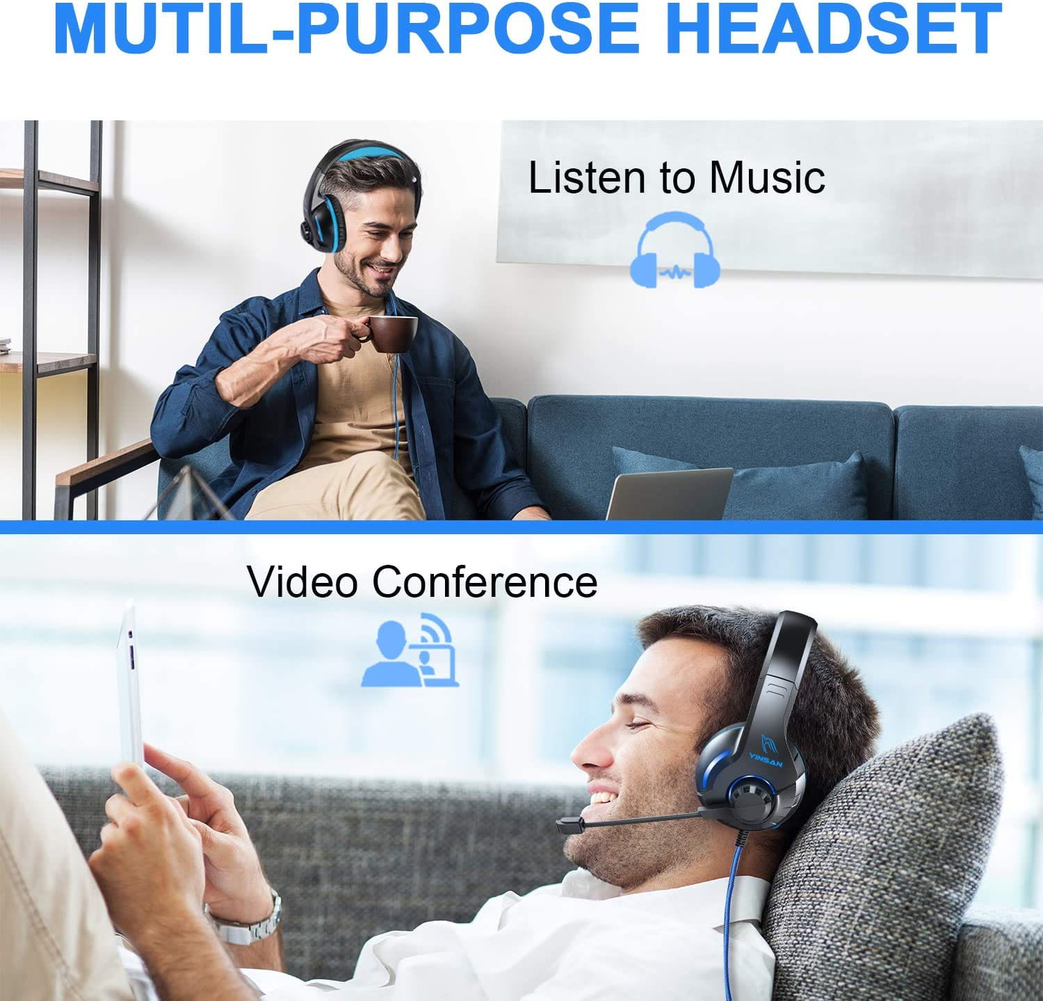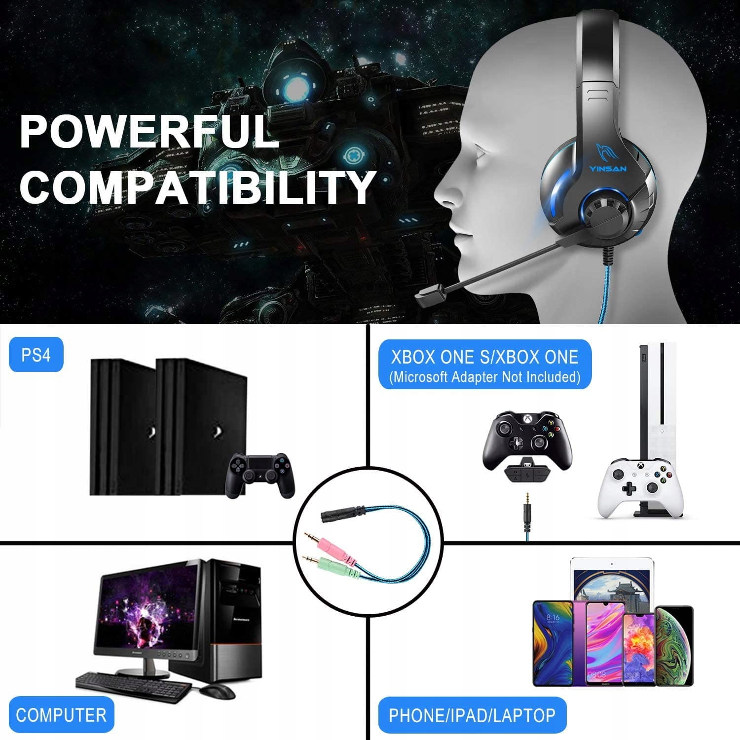 - Zestaw słuchawkowy do gier o dużej kompatybilności - Zestaw słuchawkowy do gier YINSAN jest dobrze kompatybilny z PS4, Xbox one S, Xbox one (adapter Microsoft nie jest dołączony), komputer (ze złączem jack 3,5 mm), tablety, idealny dla graczy takich jak Halo 5 Guardians, Metal Gear Solid, Call of Duty, Star Wars Battlefront, Overwatch, World of Warcraft Legion itp.