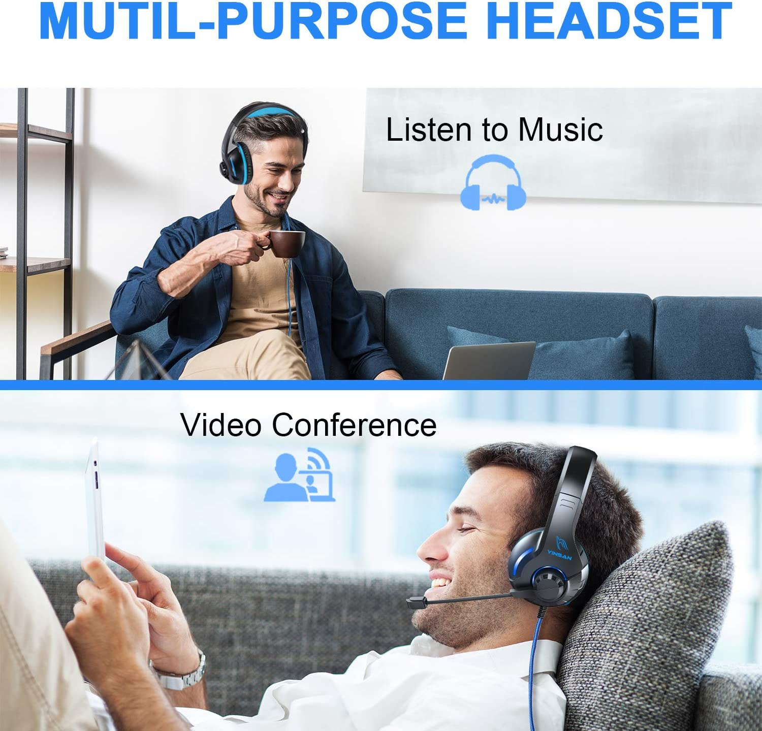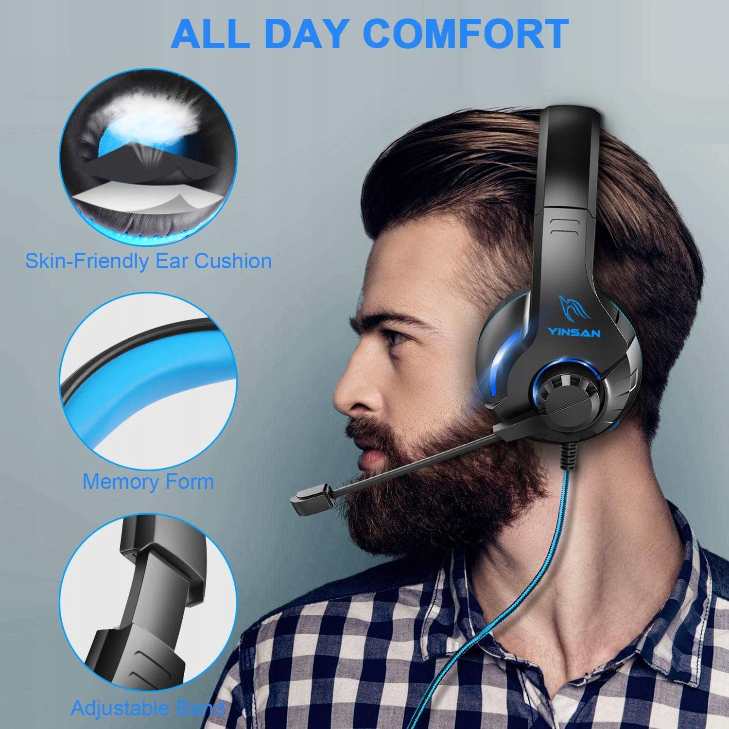YINSAN TM7, zestaw słuchawkowy do gier, zestaw słuchawkowy dla graczy z regulowanym mikrofonem, z redukcją szumów