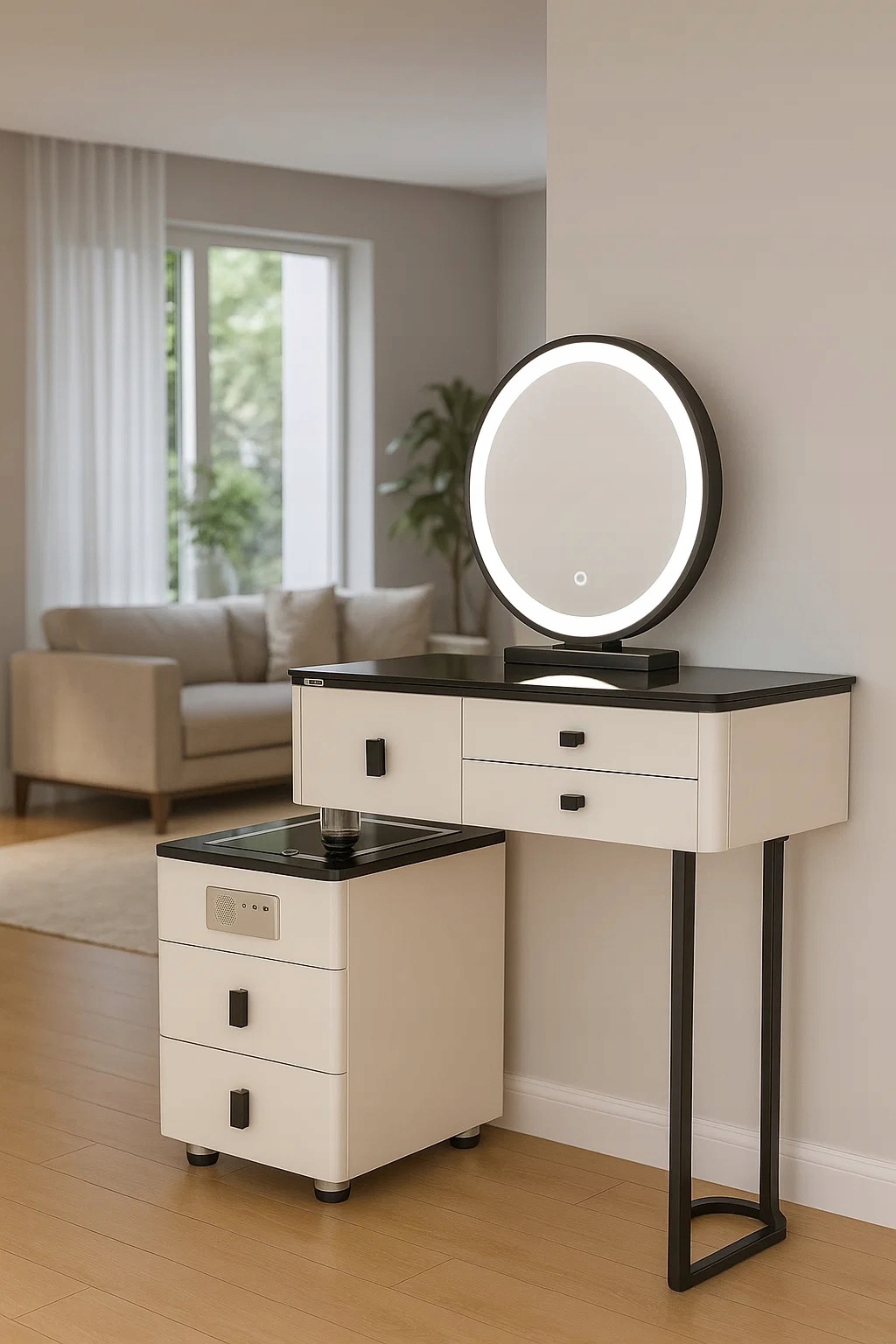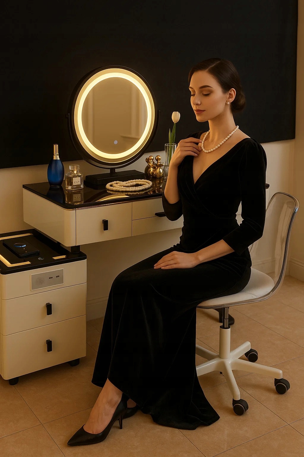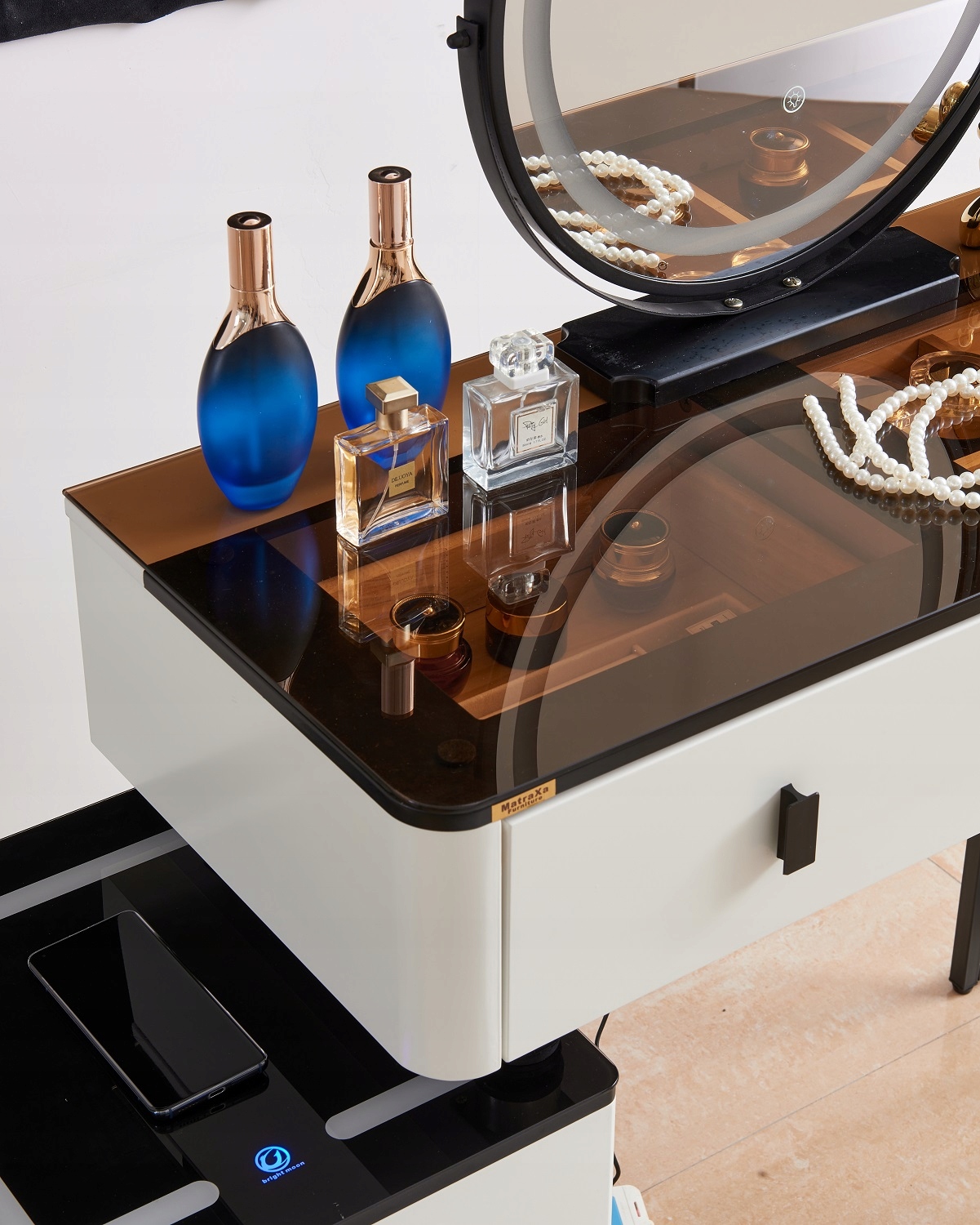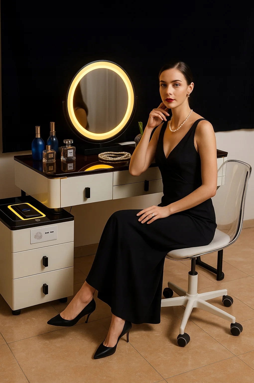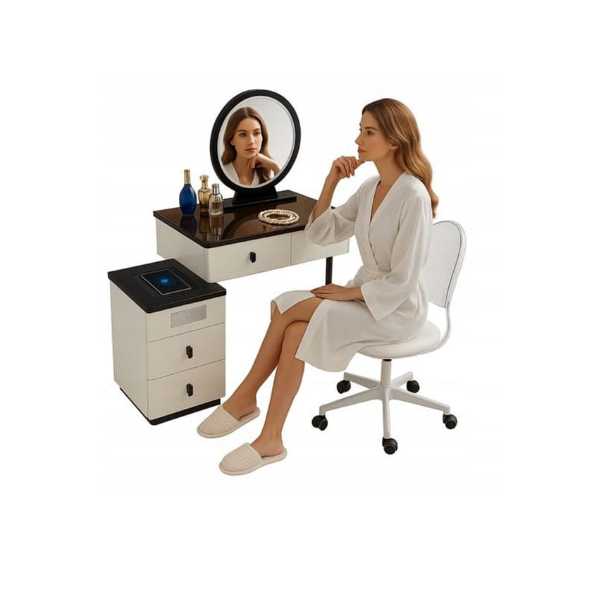 - Zanurz się w świecie toaletki - stylowej toaletki z lustrem LED, wygodnym krzesłem oraz przestronnymi szufladami.