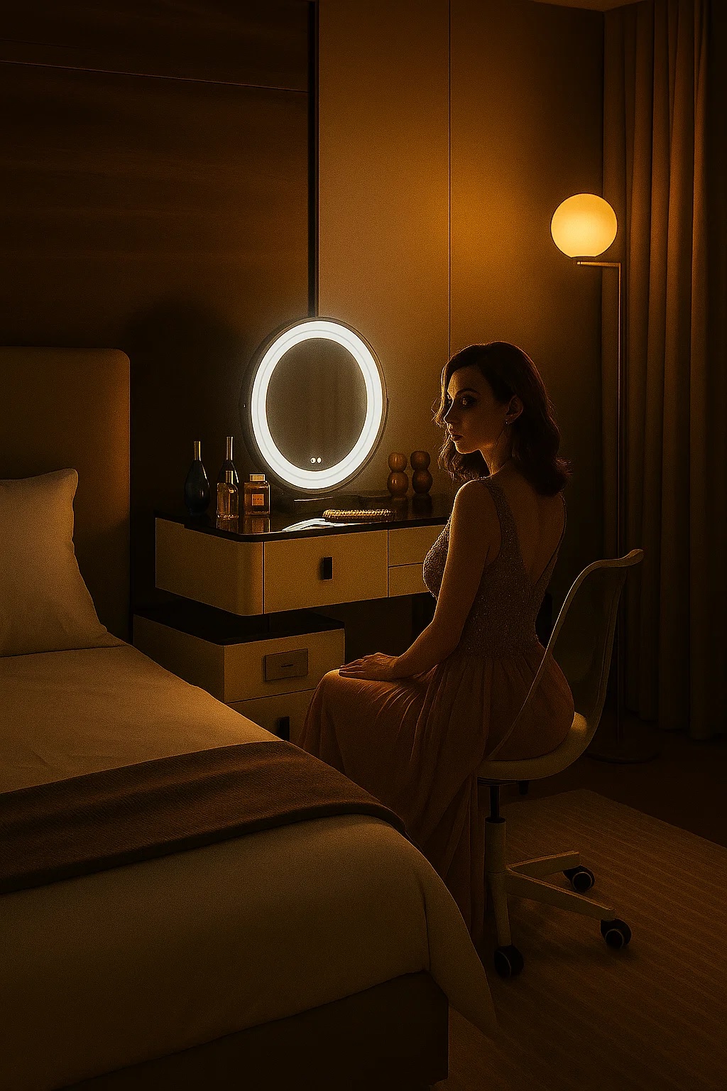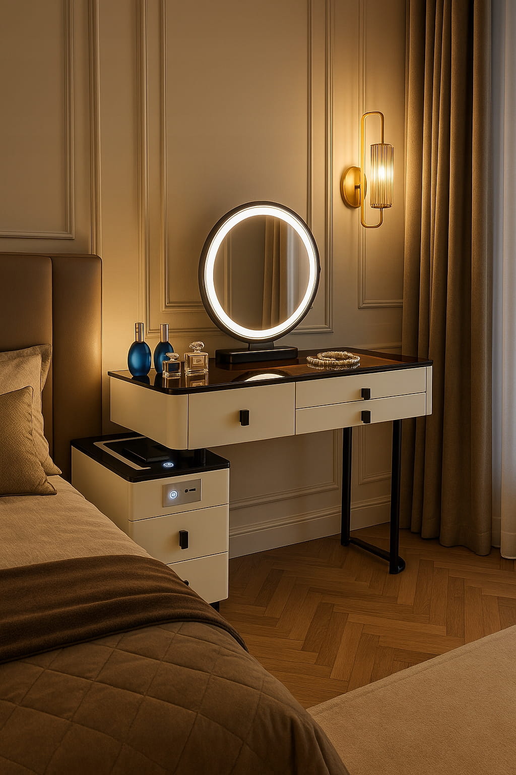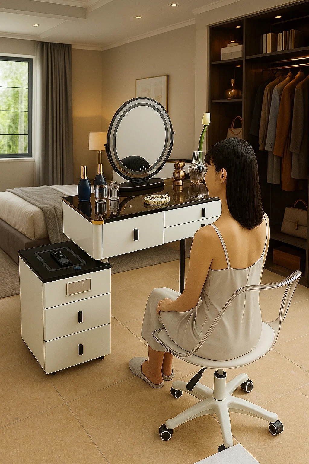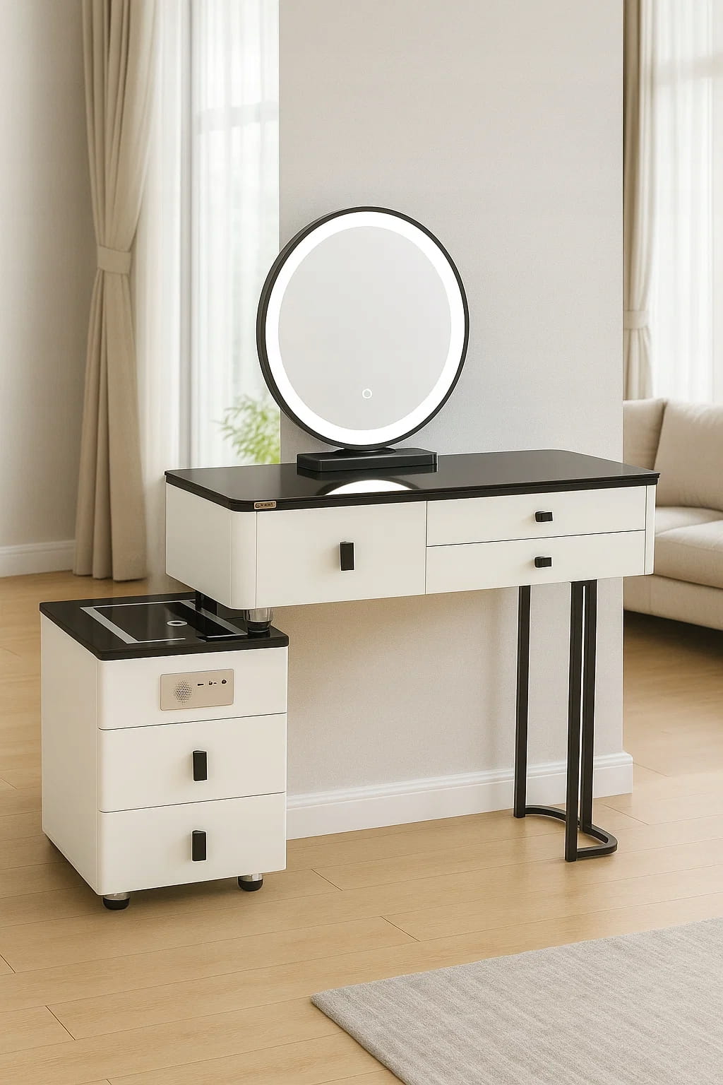 - Zanurz się w świecie toaletki - stylowej toaletki z lustrem LED, wygodnym krzesłem oraz przestronnymi szufladami.