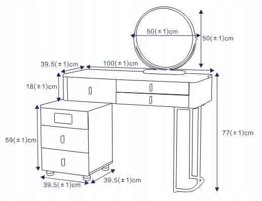 - WYMIARY PRODUKTU: Stolik do makijażu ma wymiary 100 blat i 39,5 szafka x 76 x 40 cm (szer. x wys. x gl.). Całkowita wysokość toaletki wynosi ok 130 cm