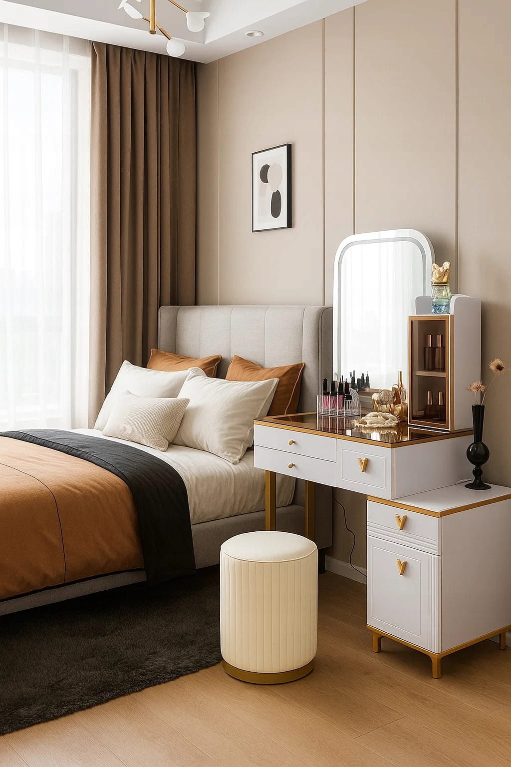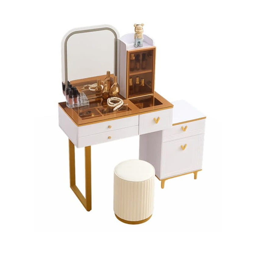 - Skorzystaj z wyjatkowych zalet naszej toaletki. Zestaw zawiera lustro LED i elegancką pufę - wraz z nowoczesnym wzornictwem i dużą przestrzenią do przechowywania kosmetyków do makijażu.