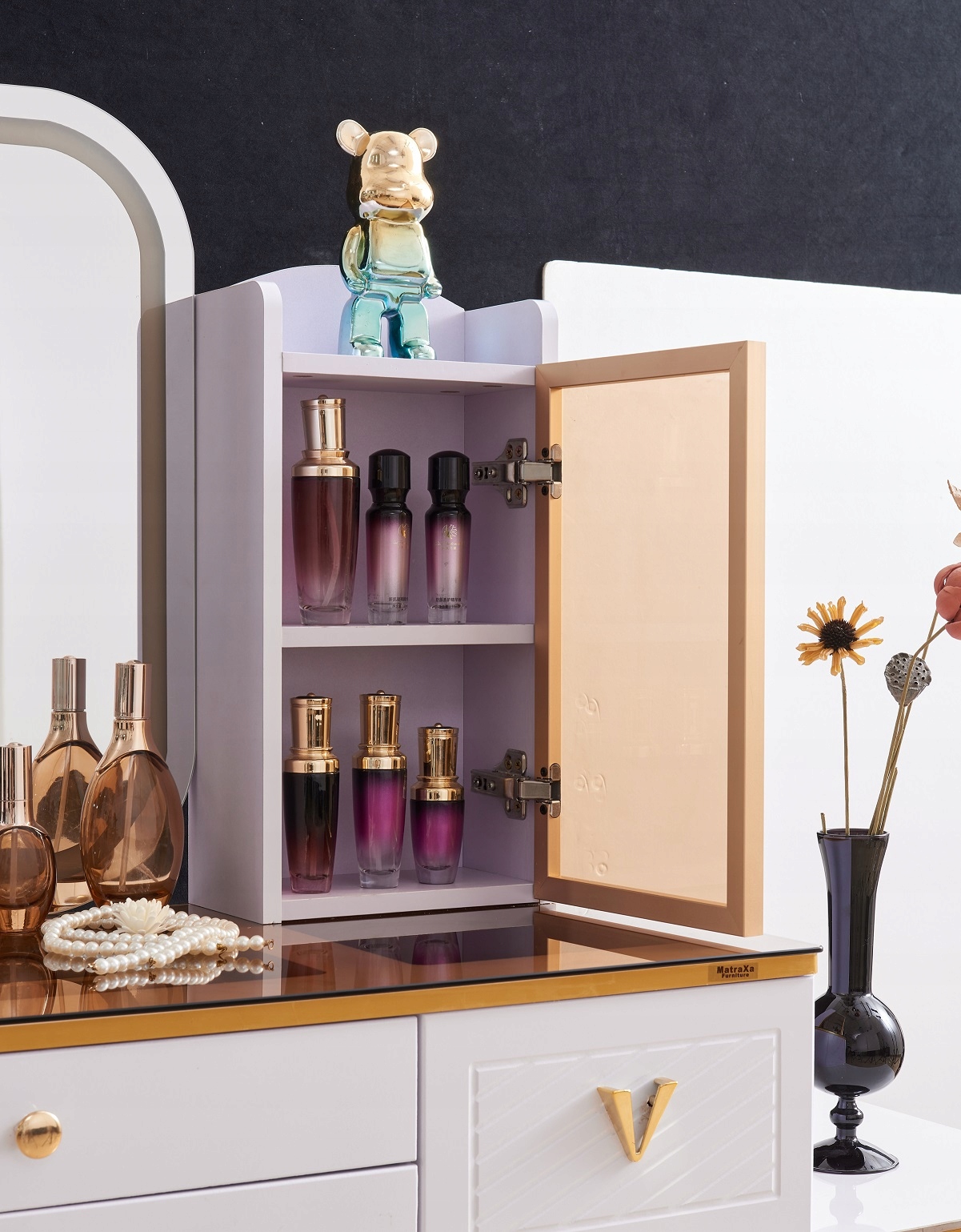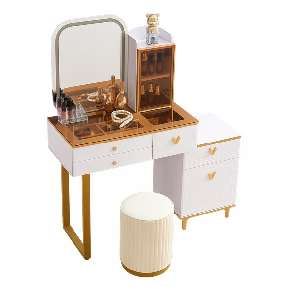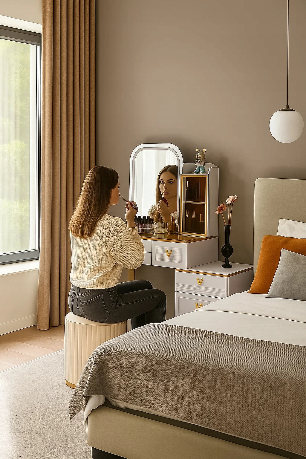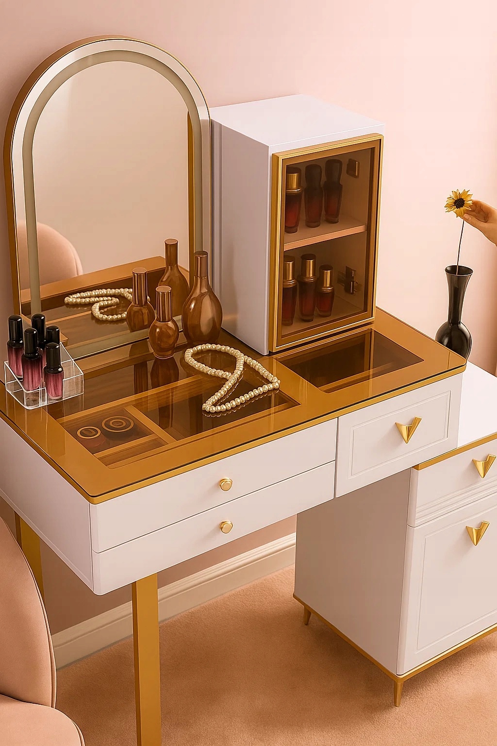 - Zanurz sie w świecie toaletki - stylowej toaletki z lustrem LED, wygodną pufą oraz przestronnymi szufladami.
