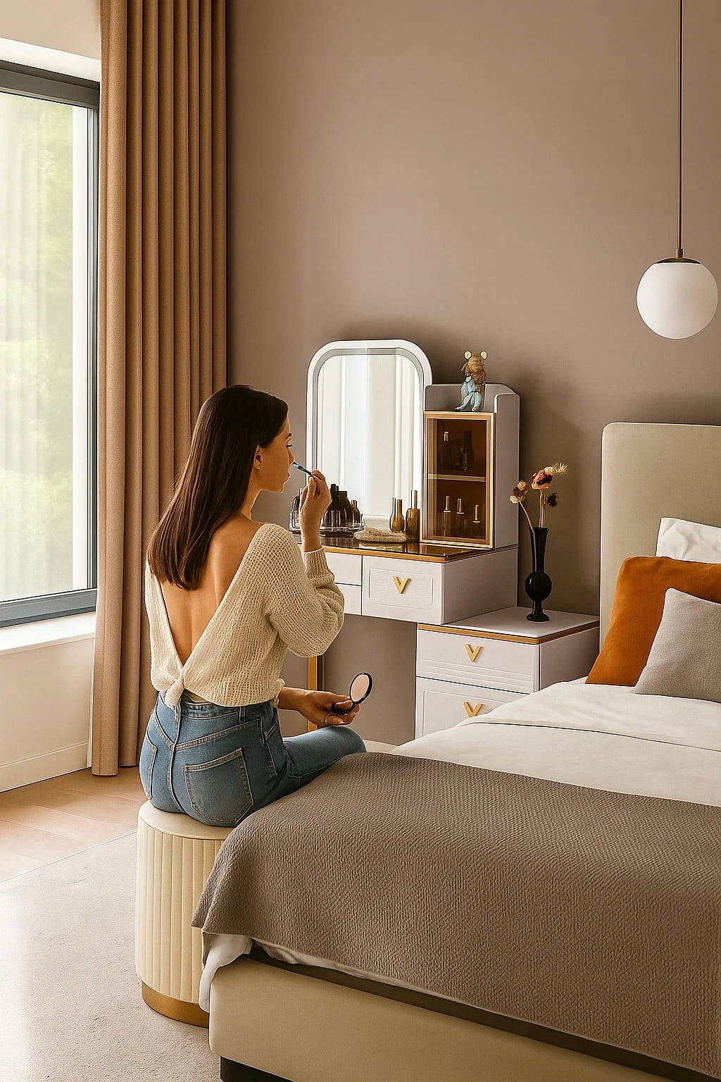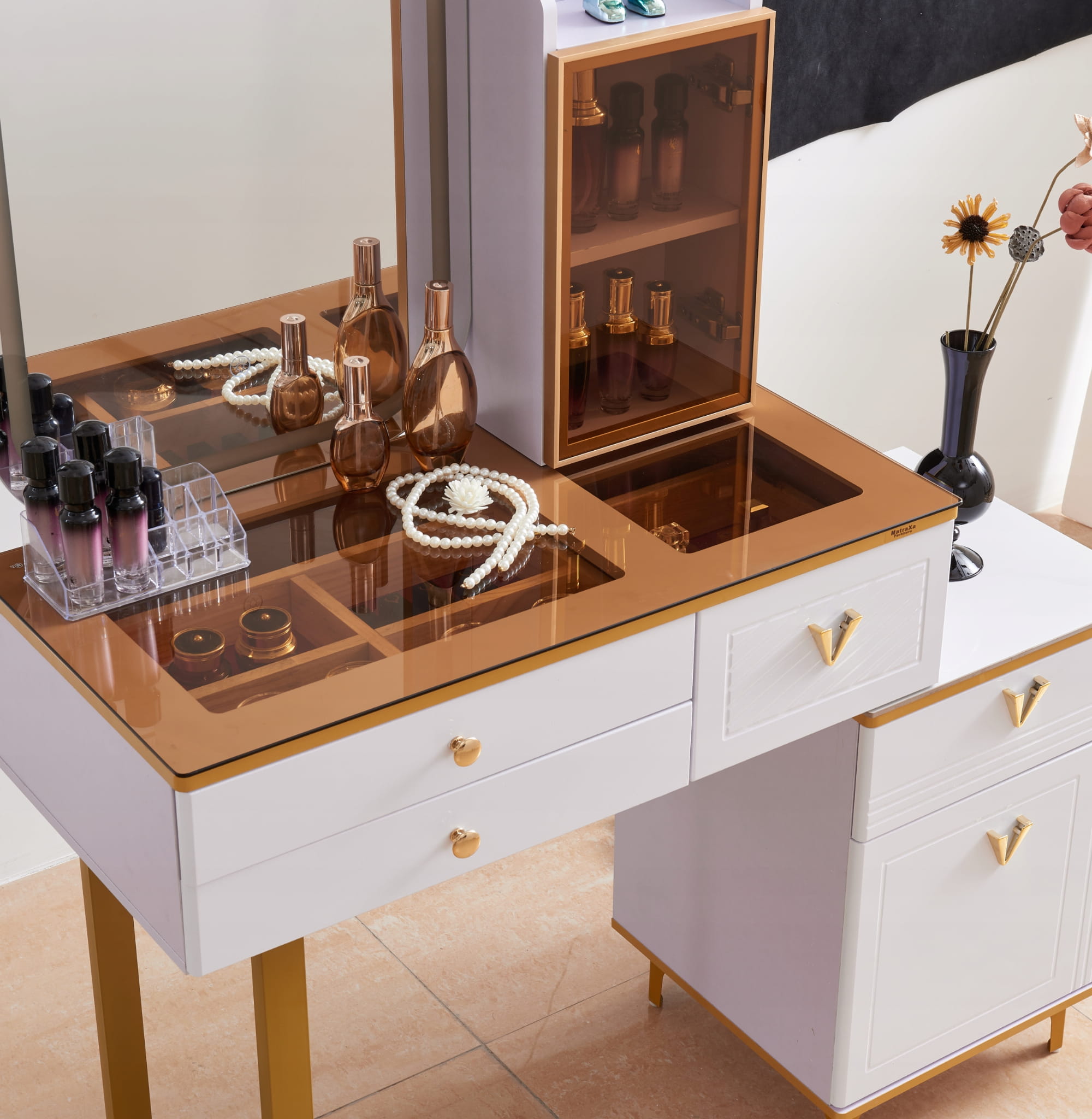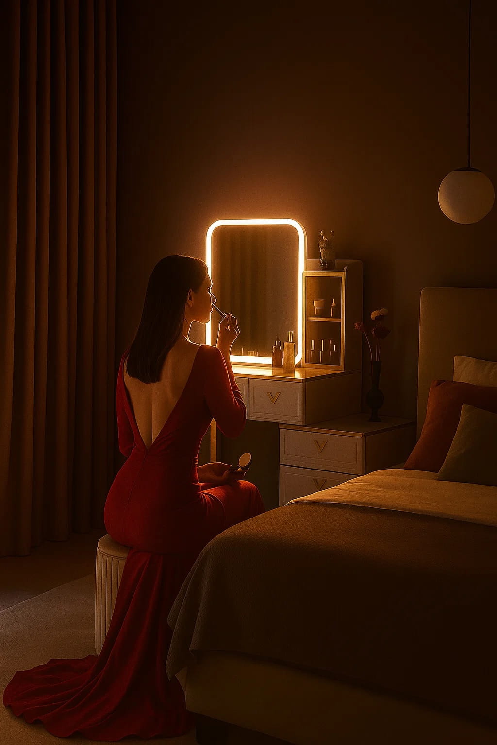 - Zanurz sie w świecie toaletki - stylowej toaletki z lustrem LED, wygodną pufą oraz przestronnymi szufladami.