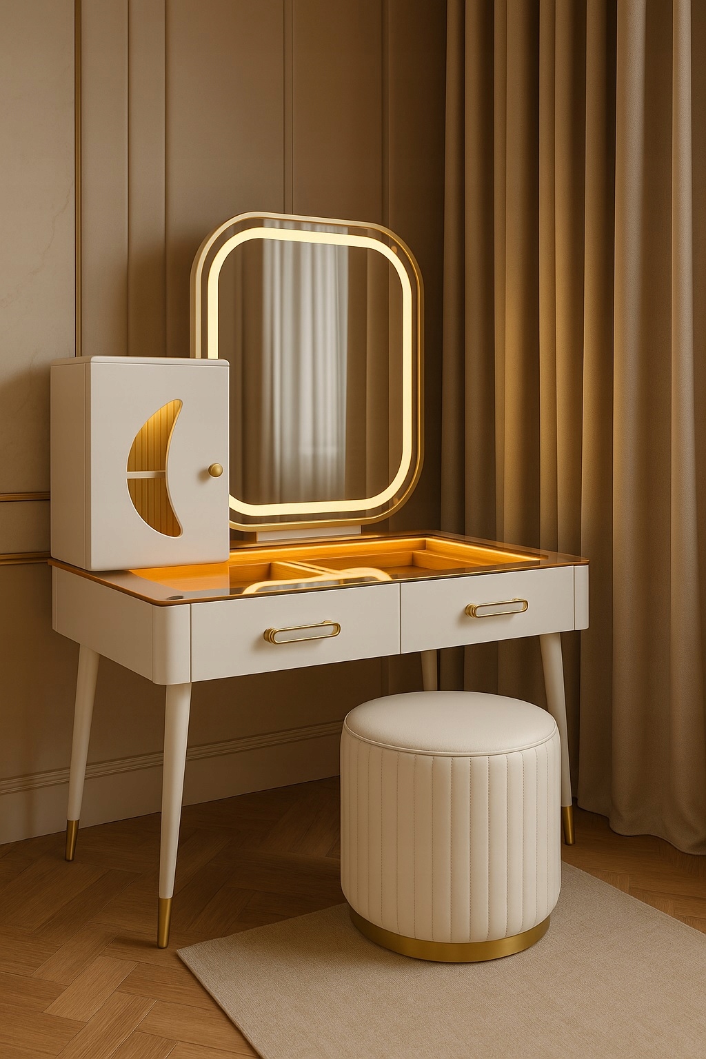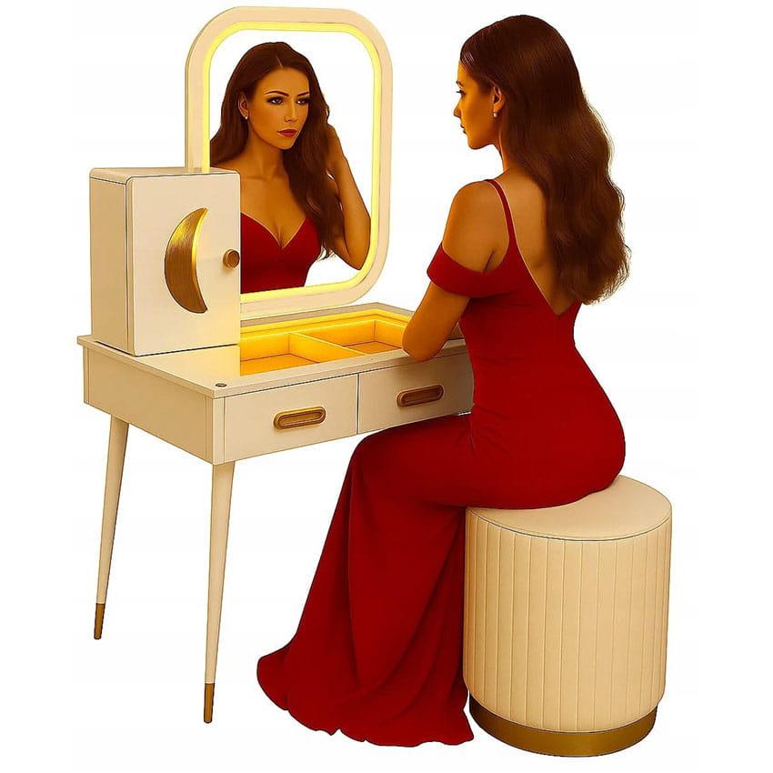 - Skorzystaj z wyjatkowych zalet naszej toaletki. Zestaw zawiera lustro LED i elegancką pufę- wraz z nowoczesnym wzornictwem i dużą przestrzenią do przechowywania kosmetyków do makijażu.