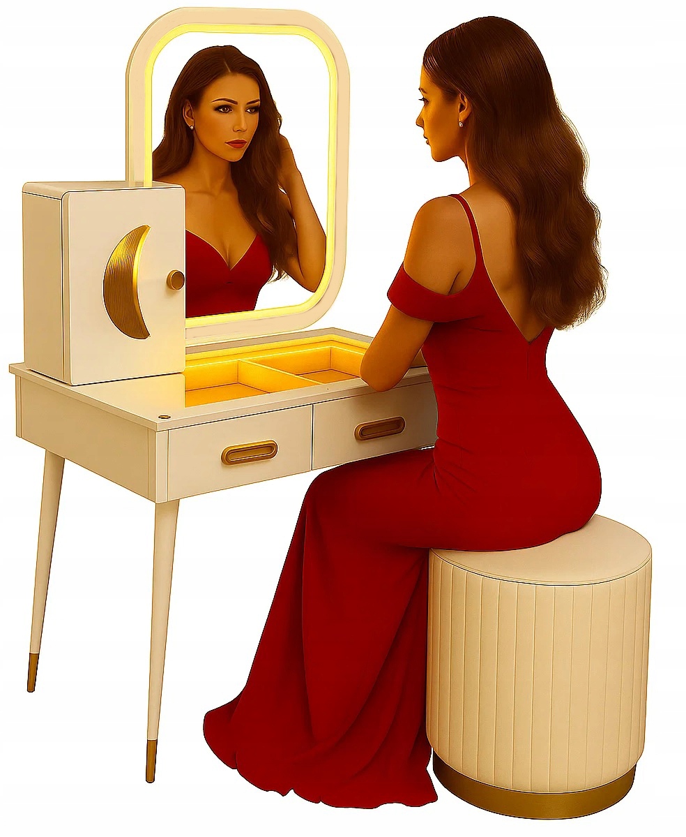 - Zanurz sie w świecie toaletki - stylowej toaletki z lustrem LED, wygodną pufą oraz przestronnymi szufladami..