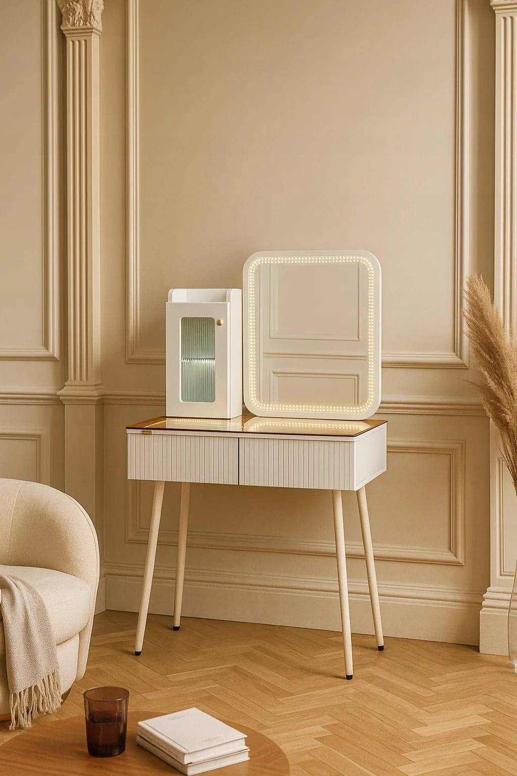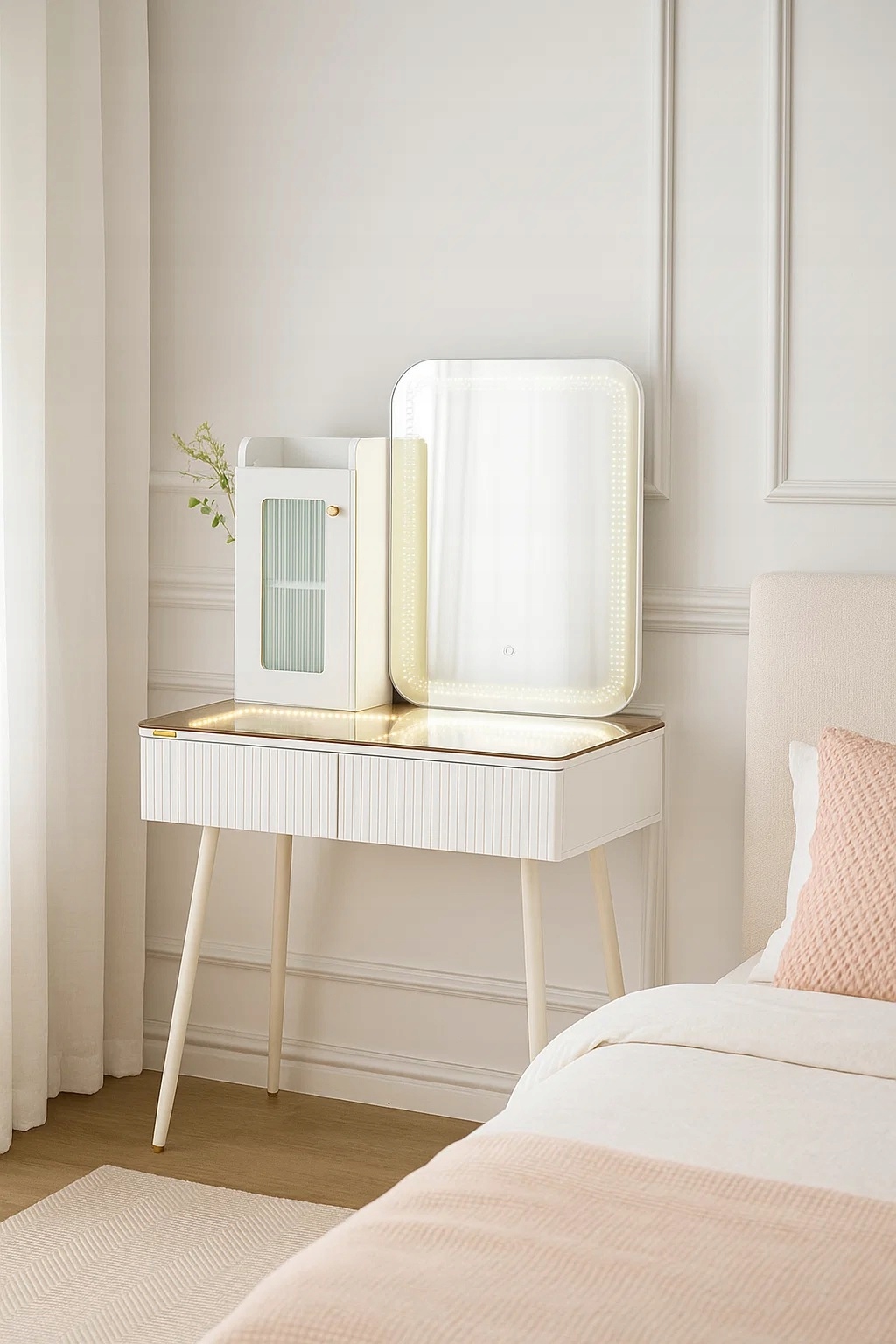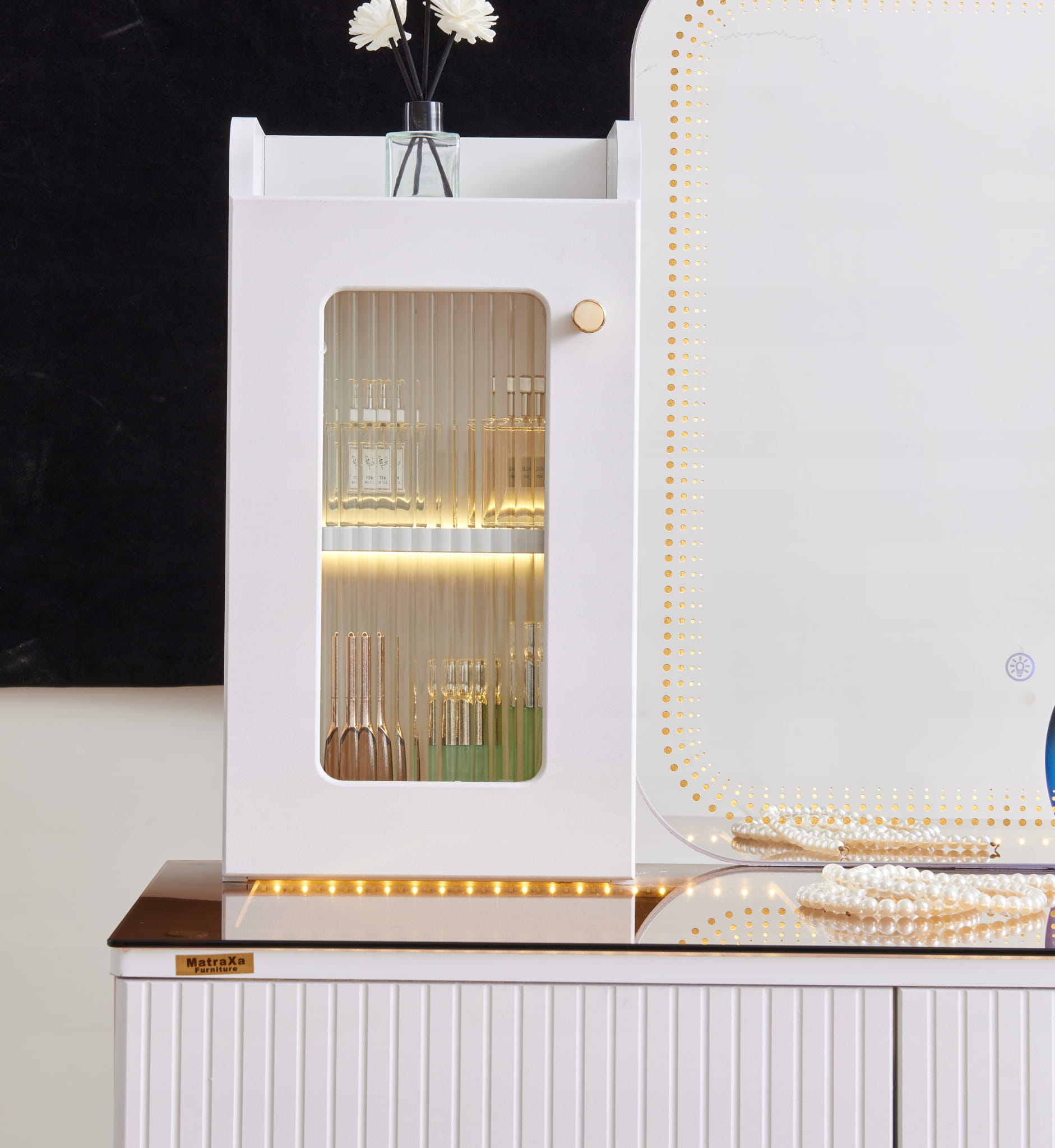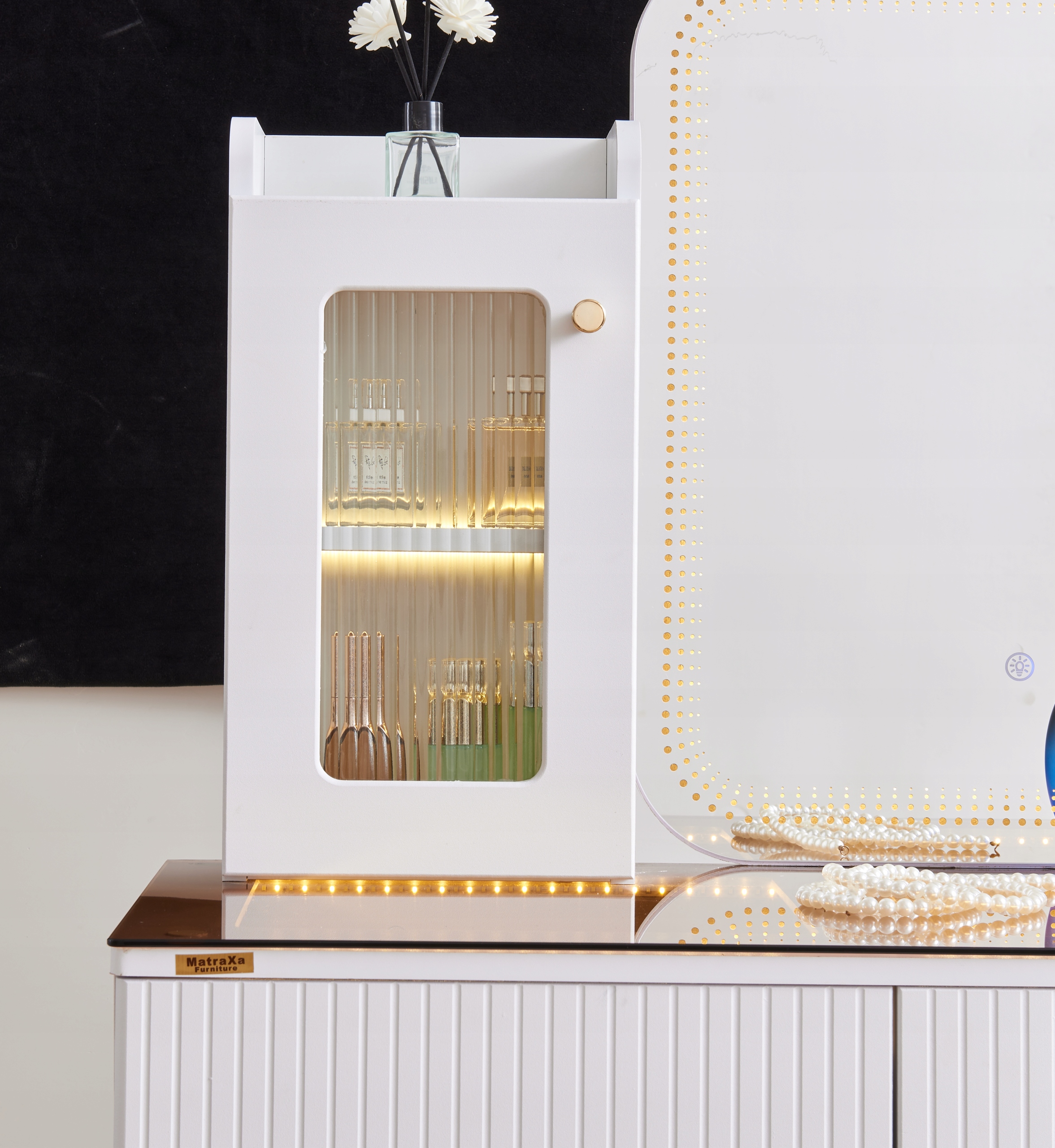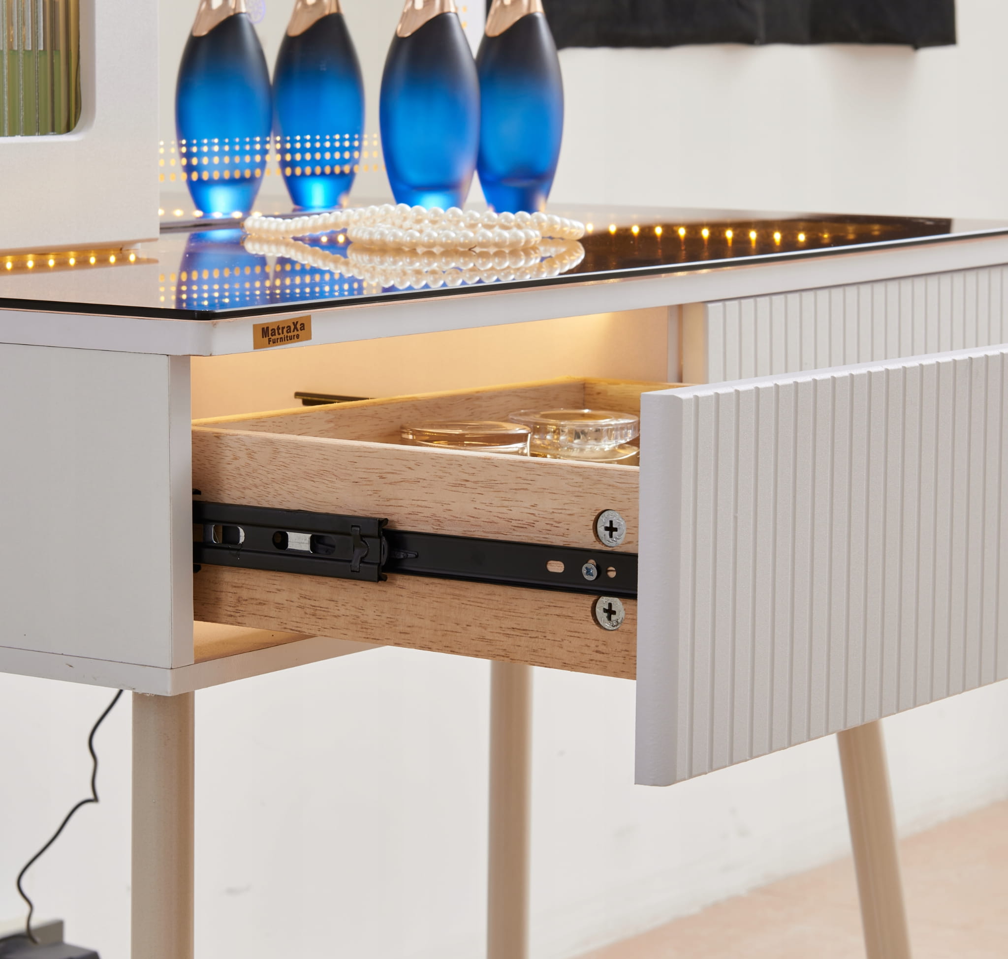 - Zanurz sie w swiecie toaletki - stylowej toaletki z lustrem LED, wygodną pufą oraz przestronnymi szufladami.