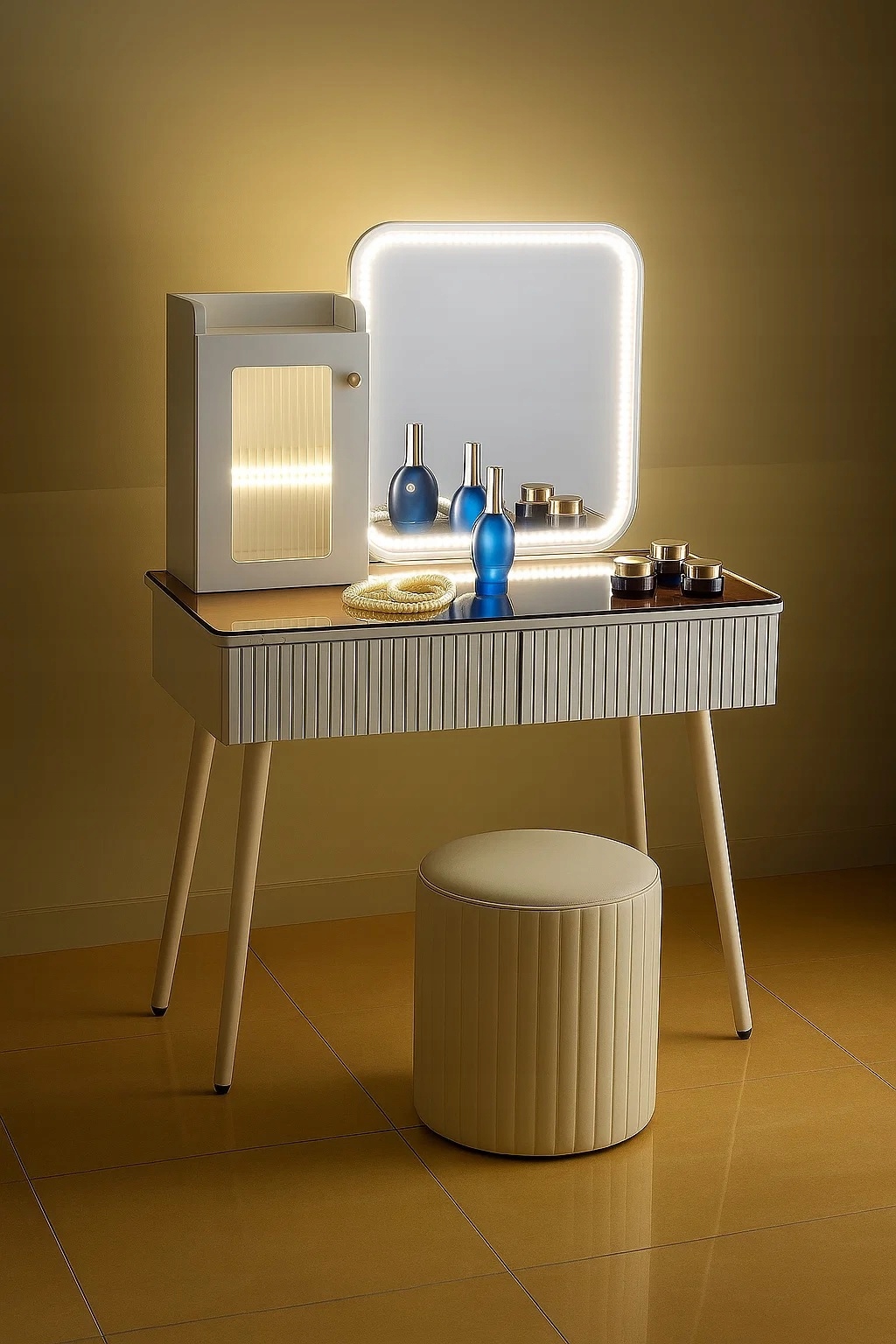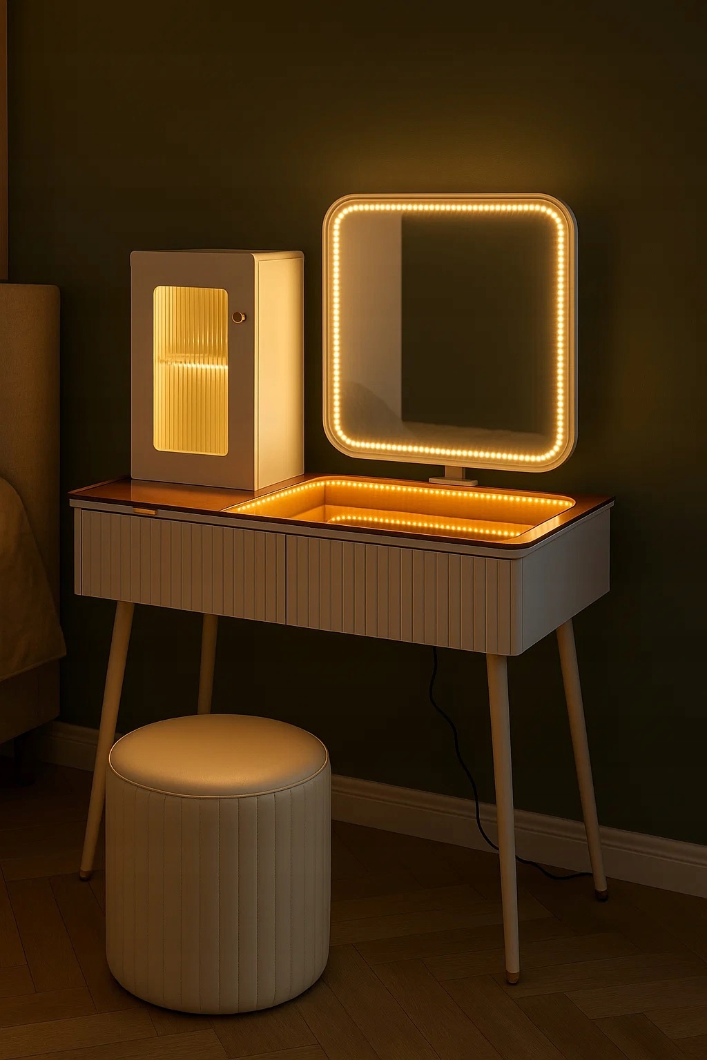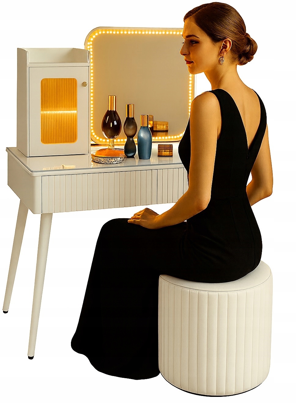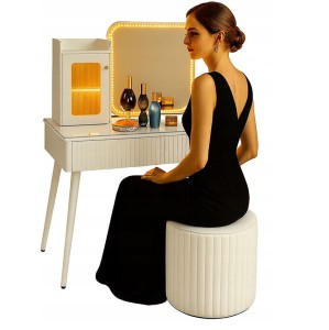 - Skorzystaj z wyjatkowych zalet naszej toaletki. Zestaw zawiera lustro LED i elegancką pufę - wraz z nowoczesnym wzornictwem i dużą przestrzenią do przechowywania kosmetyków do makijażu.