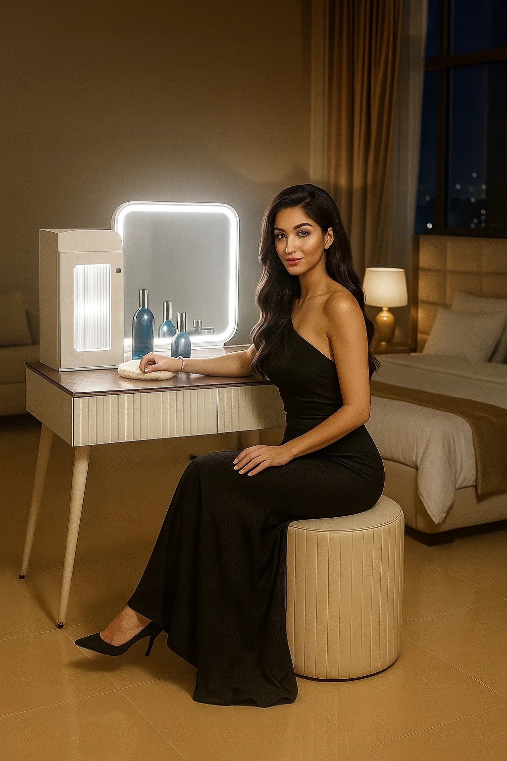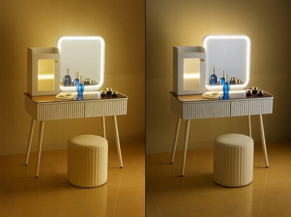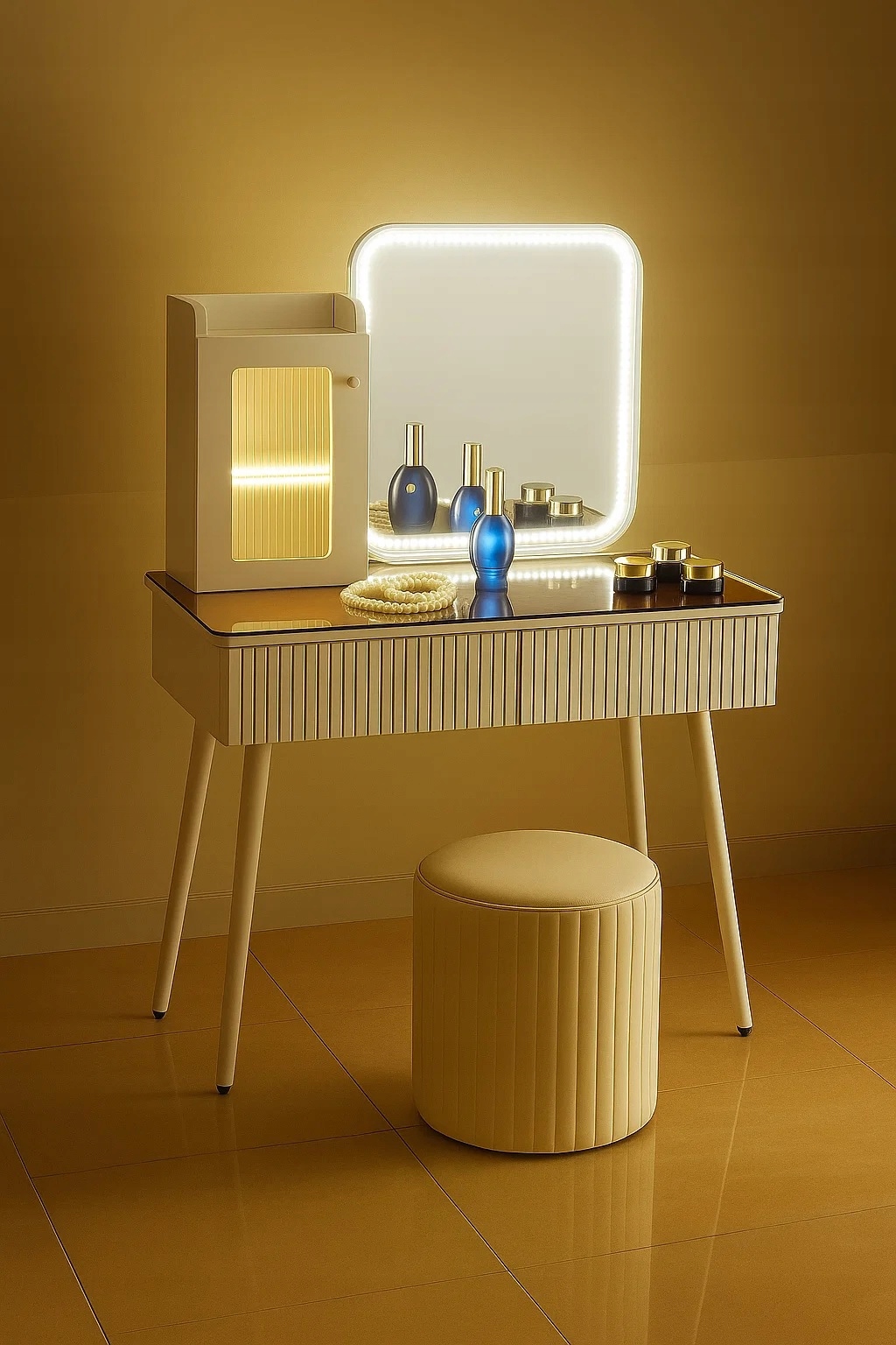 - Skorzystaj z wyjatkowych zalet naszej toaletki. Zestaw zawiera lustro LED i elegancką pufę - wraz z nowoczesnym wzornictwem i dużą przestrzenią do przechowywania kosmetyków do makijażu.