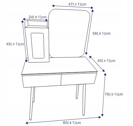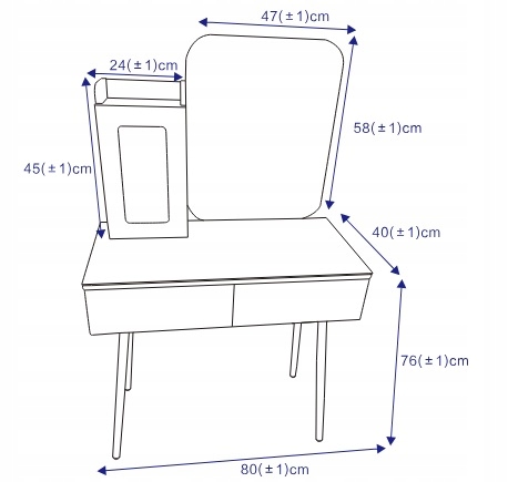 - WYMIARY PRODUKTU: Stolik do makijazu ma wymiary 80 x 76 x 40 cm (szer. x wys. x gl.). Calkowita wysokość toaletki wynosi 134 cm